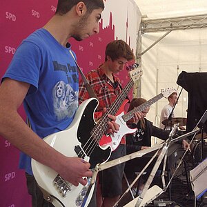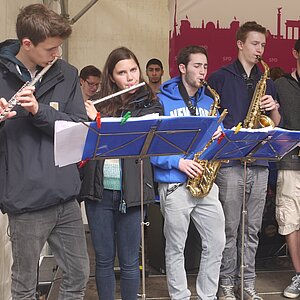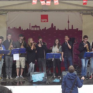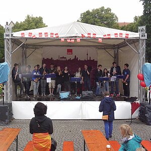 Bei sehr wechselhaftem Wetter absolvierten die Big Band und die Tontechnik unserer Schule ihren mittlerweile schon traditionellen Sommerauftritt auf dem Kiezfest der SPD auf dem Rüdesheimer Platz. Mit einer bunten Mischung aus Klassikern des Jazz und Soul sowie aktuellen Hits begeisterten Musiker und Techniker das Publikum, das trotz der unberechenbaren Regenschauer an diesem Tag tapfer ausharrte. Alle Beteiligten, von denen einige aufgrund ihres Abiturs leider das letzte Mal dabei waren, wurden für ihr Engagement mit zahlreichem Applaus belohnt!