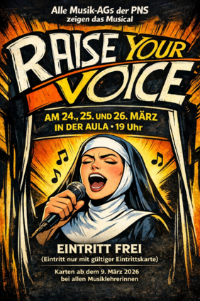 Am 24., 25. und 26. März 2026 führen alle Musik-AGs gemeinsam das Musical „Raise your voice“ auf. Die Vorstellungen beginnen jeweils um 19 Uhr. Kostenlose Tickets gibt es ab 9. März bei den Musiklehrerinnen (Raum 003).