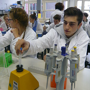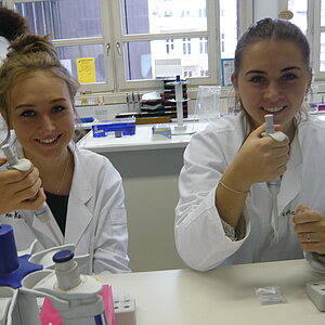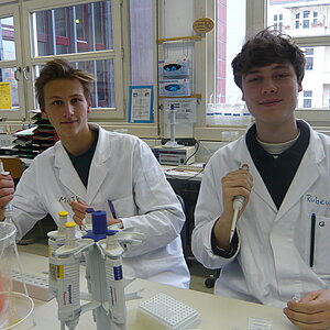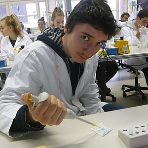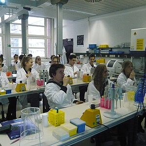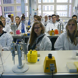Der erste Teil begann mit einer kurzen Präsentation über die menschliche DNA (Desoxyribonukleinsäure) und deren Aufbau, die in erster Linie dazu diente, unser Wissen über das Thema aufzufrischen, uns aber auch mit einigen interessanten neuen Fakten überraschte. So erfuhren wir beispielsweise, dass die Länge der DNA 25 Mal die Strecke von der Erde zur Sonne abdecken würde oder dass die Anzahl der Chromosomen beim Menschen niedriger ist als etwa bei der Kartoffel, woraus folgt, dass die Chromosomenzahl nichts über die Komplexität eines Organismus aussagt. Anschließend gab es eine Einweisung in die Arbeit im Labor und speziell in den Umgang mit komplexeren Pipetten.
