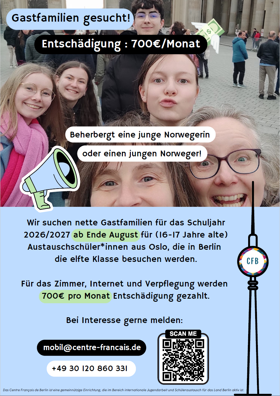 - Alle Teilnehmer*innen sollen möglichst von Beginn des Austauschjahres an dem Fachunterricht angemessen folgen können; daher sind ausreichende Deutschkenntnisse bei allen Teilnehmern erforderlich. Die Gastschüler beginnen ihr Austauschjahr daher mit einem Intensivkurs Deutsch in der letzten Ferienwoche in Berlin, der von ihren norwegischen Lehrern betreut wird.