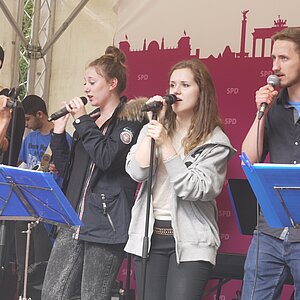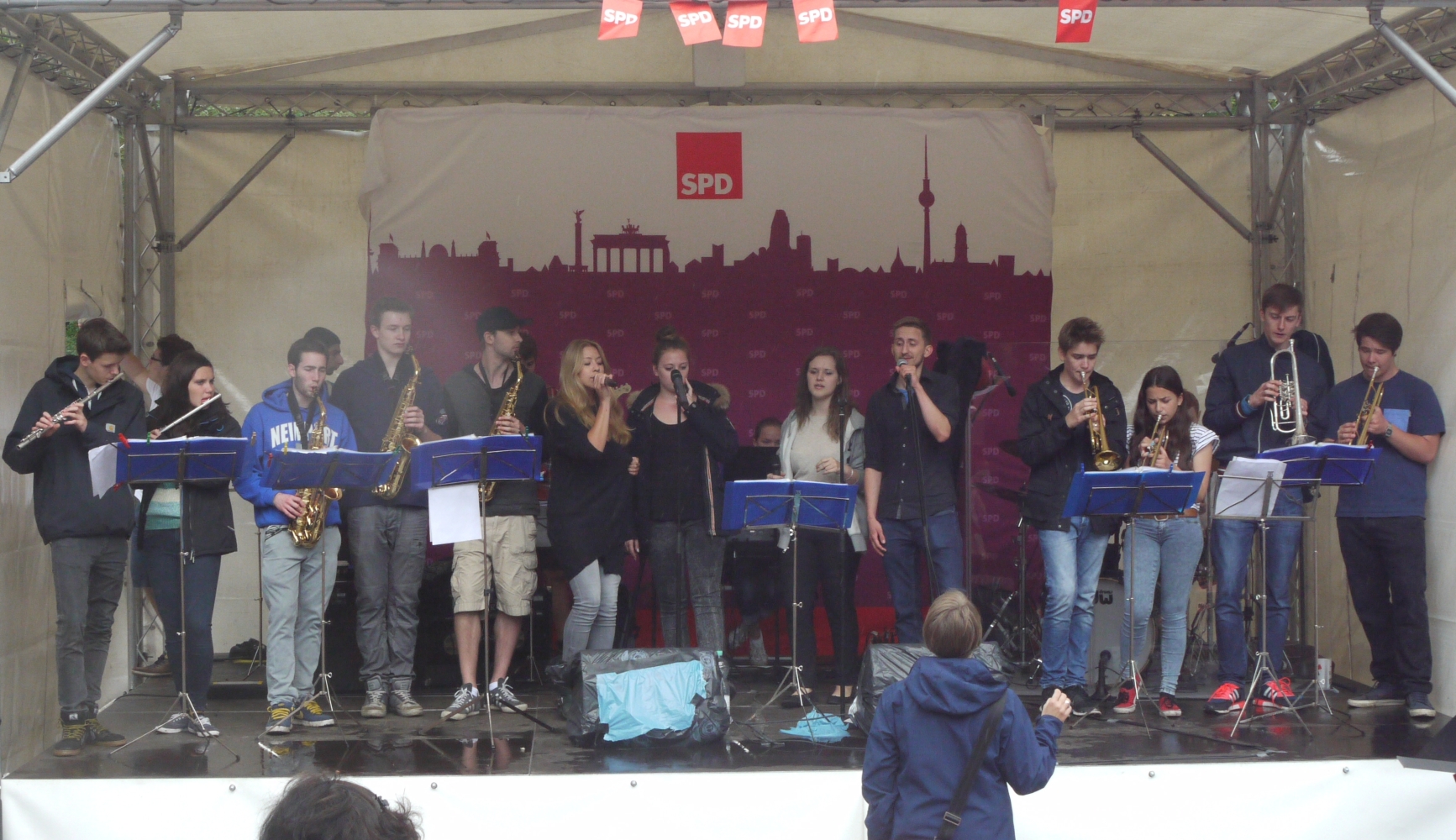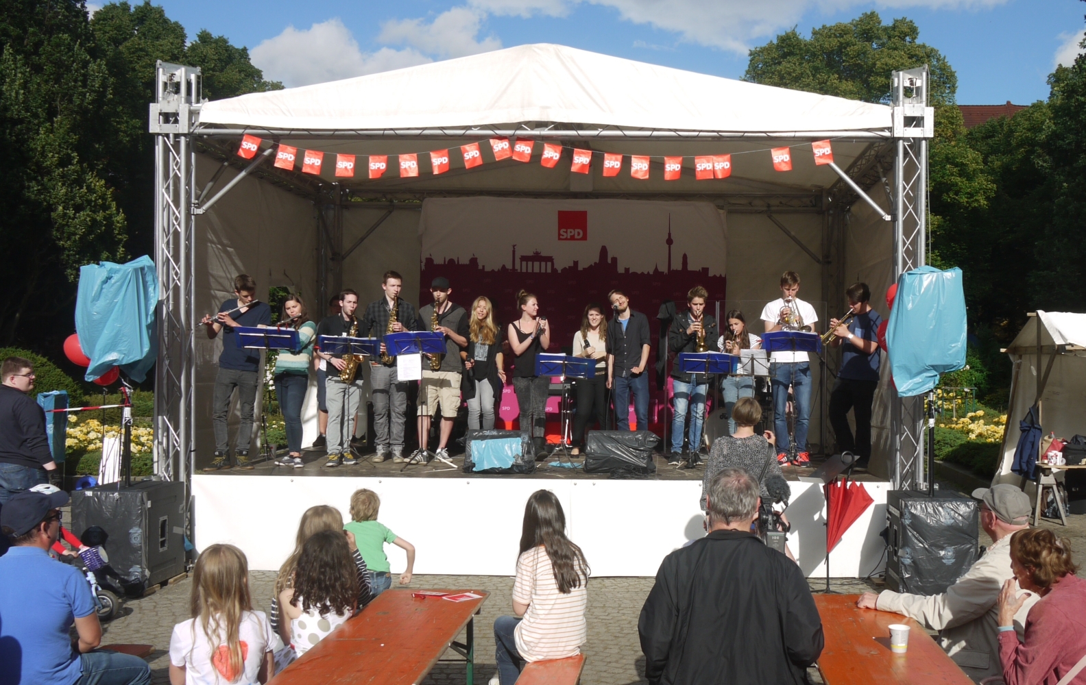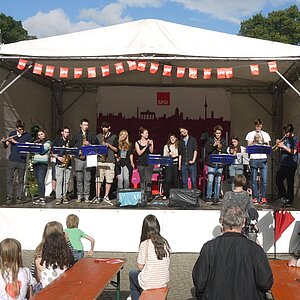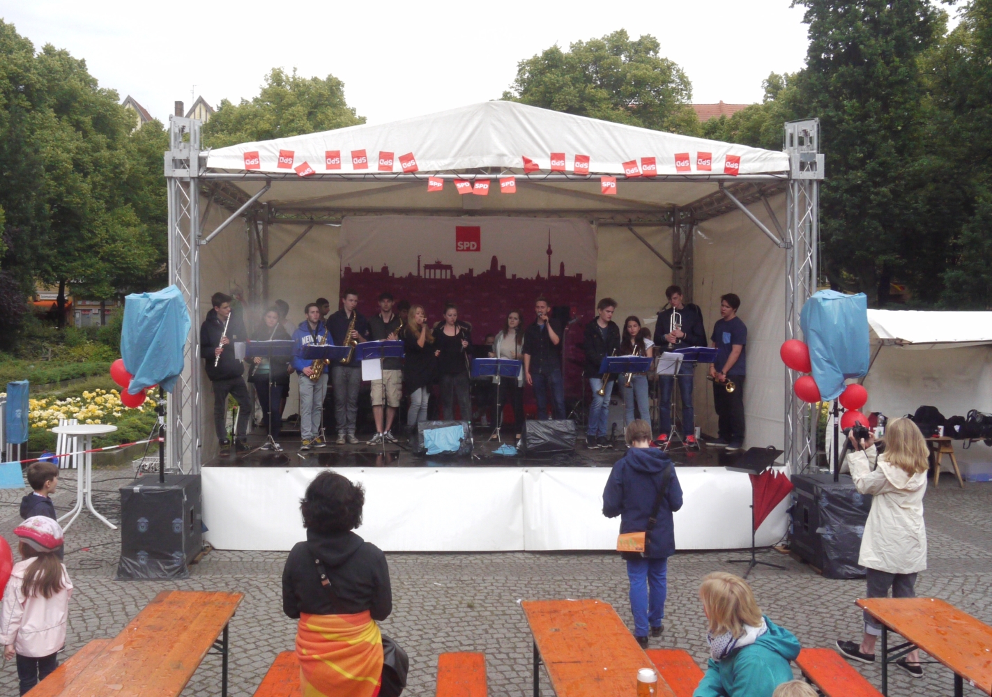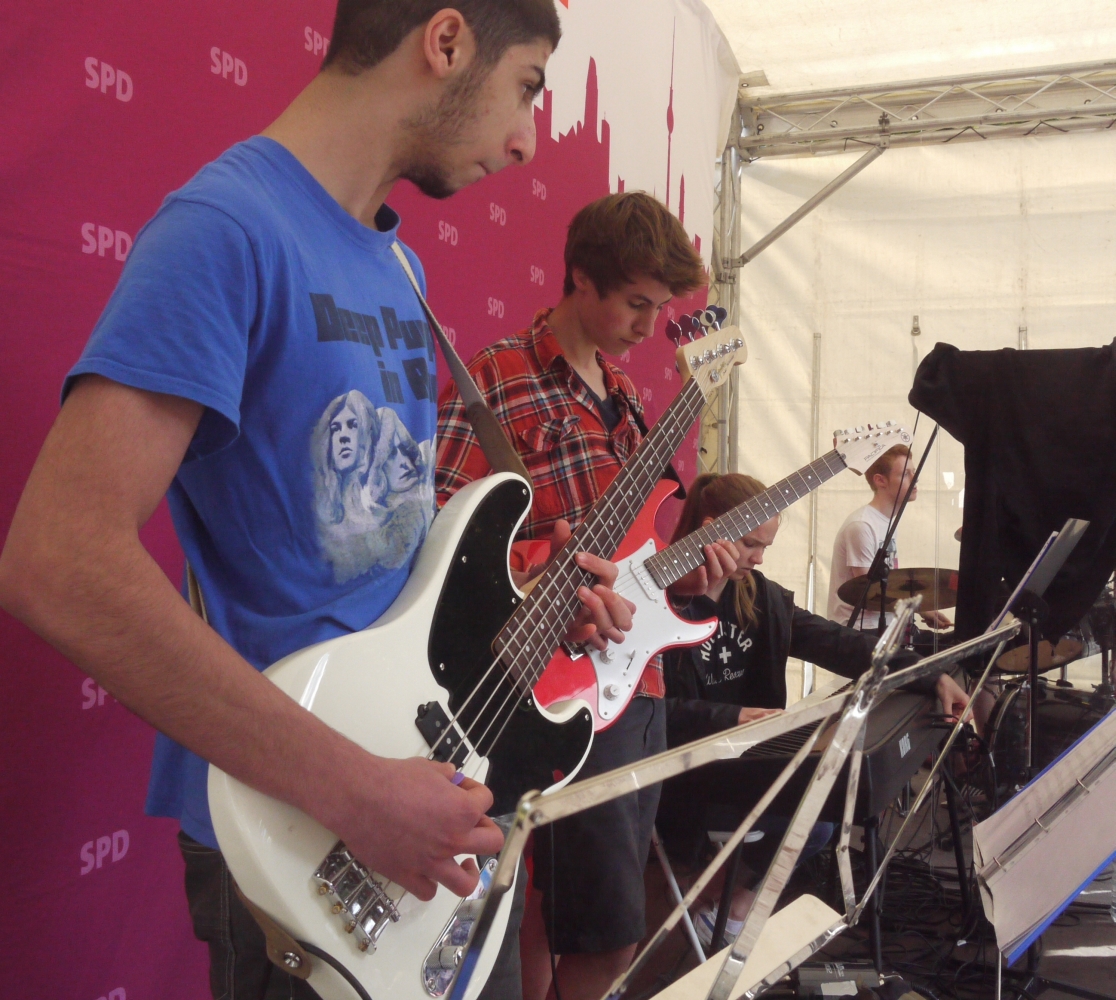 Bei sehr wechselhaftem Wetter absolvierten die Big Band und die Tontechnik unserer Schule ihren mittlerweile schon traditionellen Sommerauftritt auf dem Kiezfest der SPD auf dem Rüdesheimer Platz. Mit einer bunten Mischung aus Klassikern des Jazz und Soul sowie aktuellen Hits begeisterten Musiker und Techniker das Publikum, das trotz der unberechenbaren Regenschauer an diesem Tag tapfer ausharrte. Alle Beteiligten, von denen einige aufgrund ihres Abiturs leider das letzte Mal dabei waren, wurden für ihr Engagement mit zahlreichem Applaus belohnt!