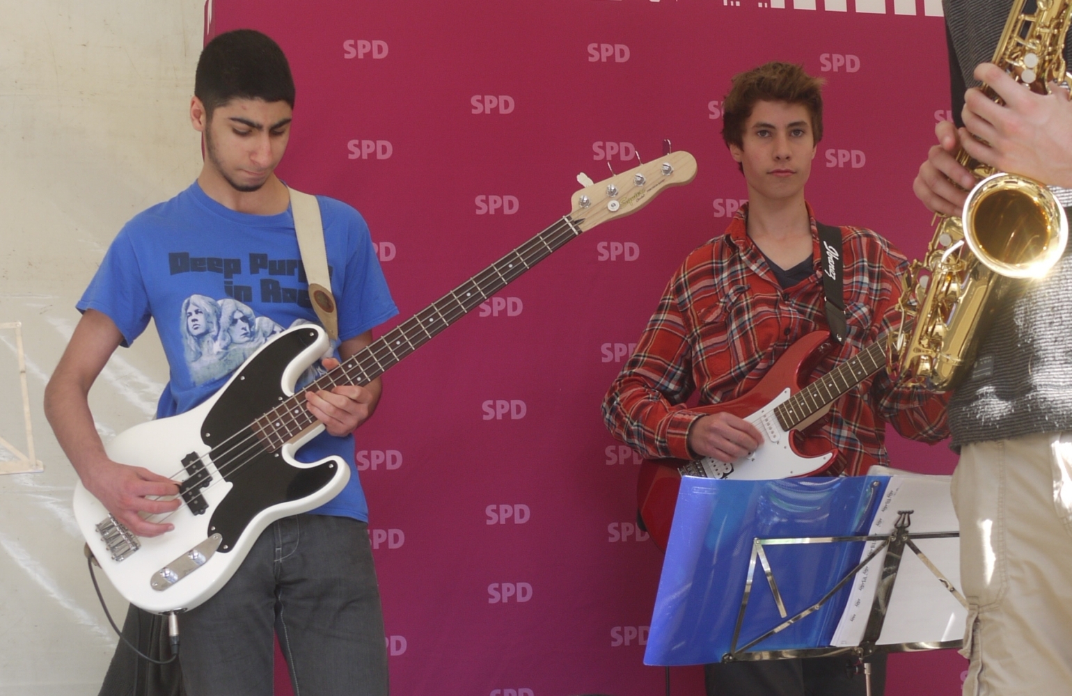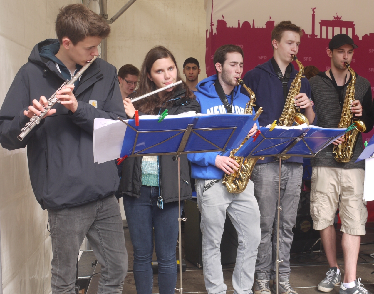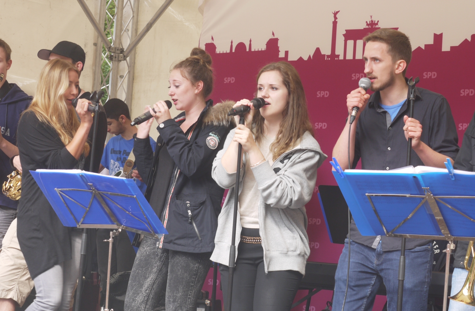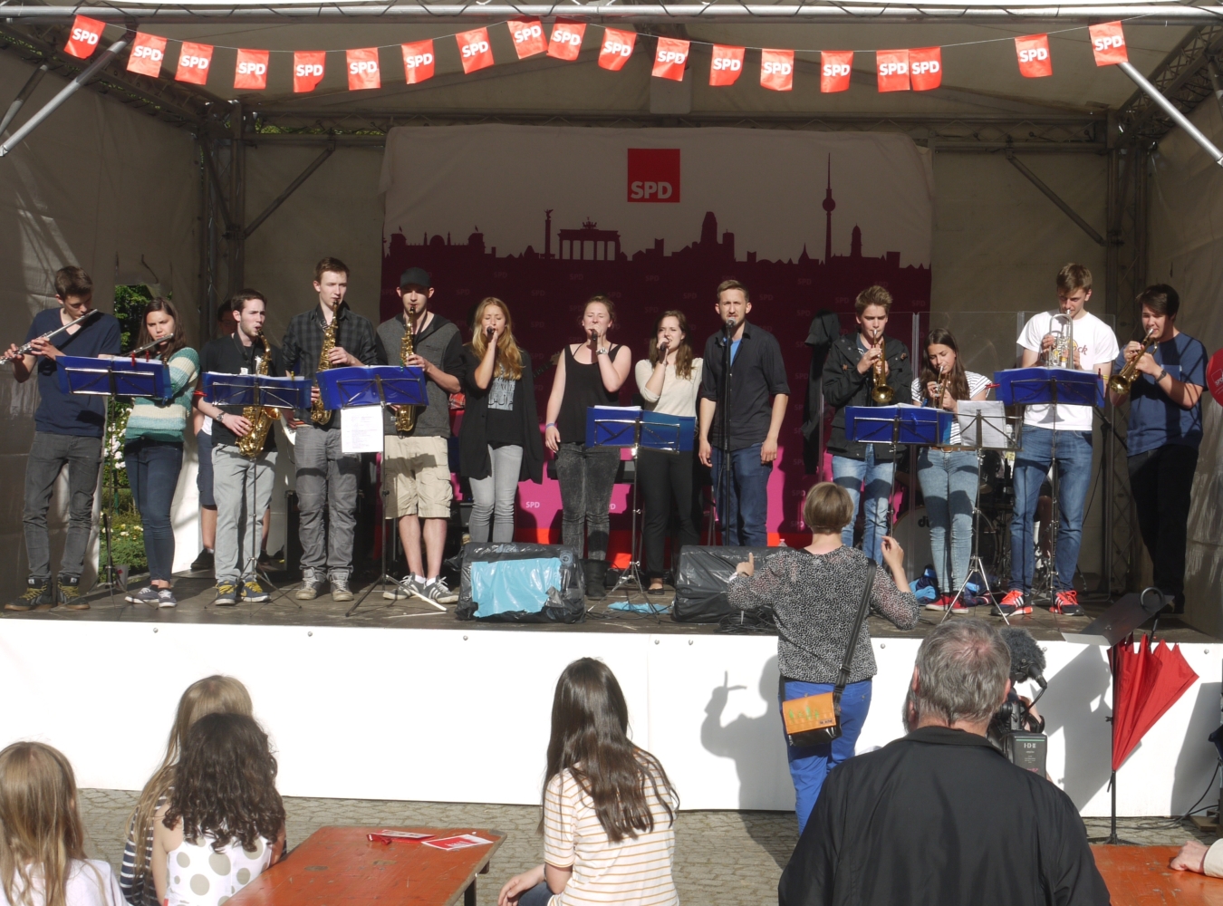 Bei sehr wechselhaftem Wetter absolvierten die Big Band und die Tontechnik unserer Schule ihren mittlerweile schon traditionellen Sommerauftritt auf dem Kiezfest der SPD auf dem Rüdesheimer Platz. Mit einer bunten Mischung aus Klassikern des Jazz und Soul sowie aktuellen Hits begeisterten Musiker und Techniker das Publikum, das trotz der unberechenbaren Regenschauer an diesem Tag tapfer ausharrte. Alle Beteiligten, von denen einige aufgrund ihres Abiturs leider das letzte Mal dabei waren, wurden für ihr Engagement mit zahlreichem Applaus belohnt!