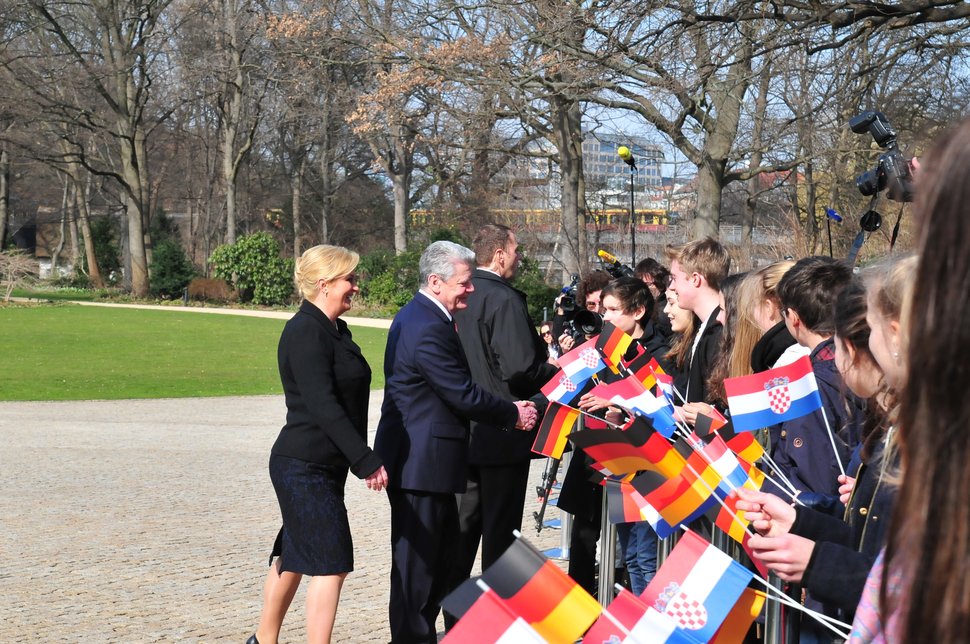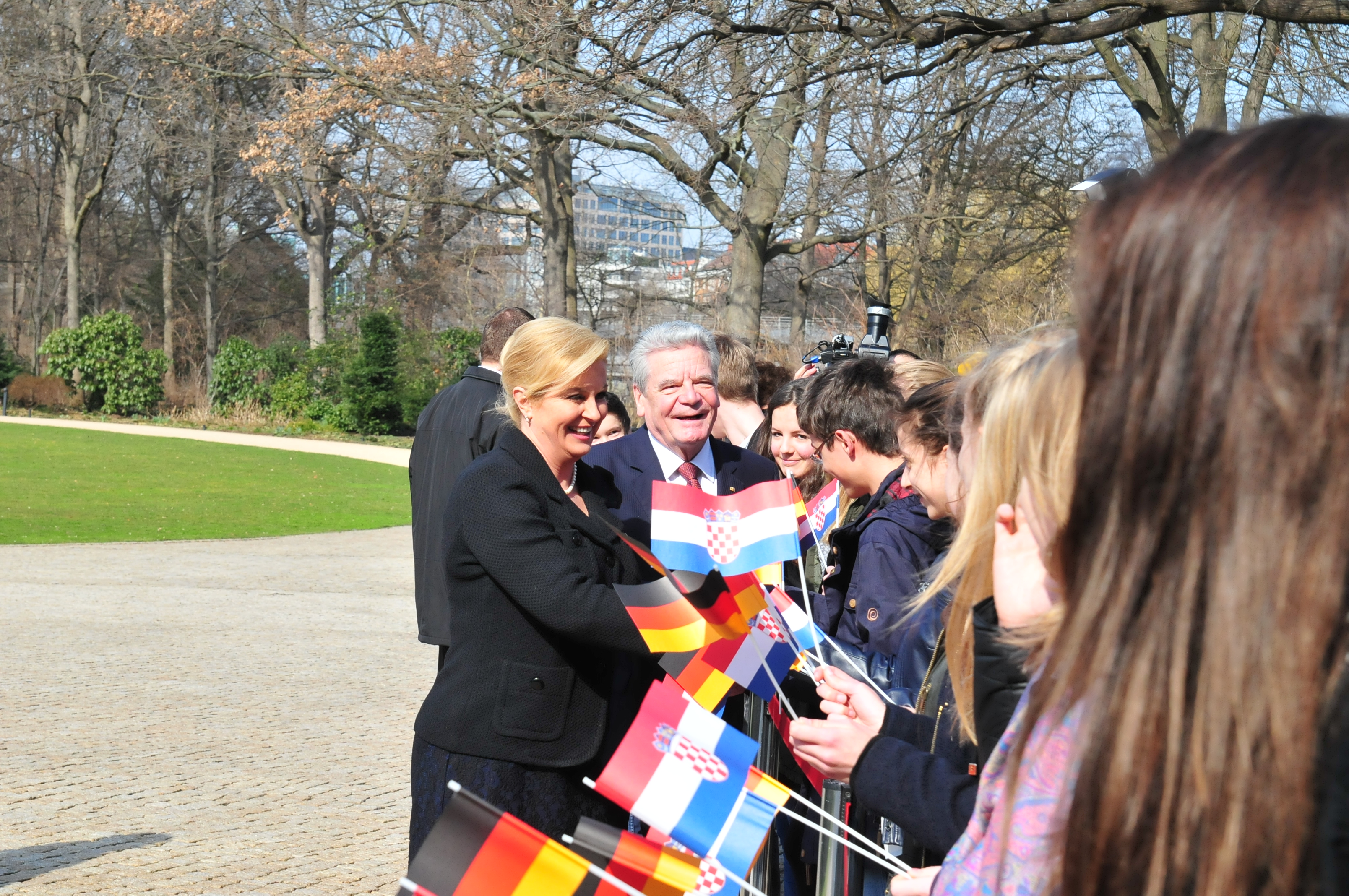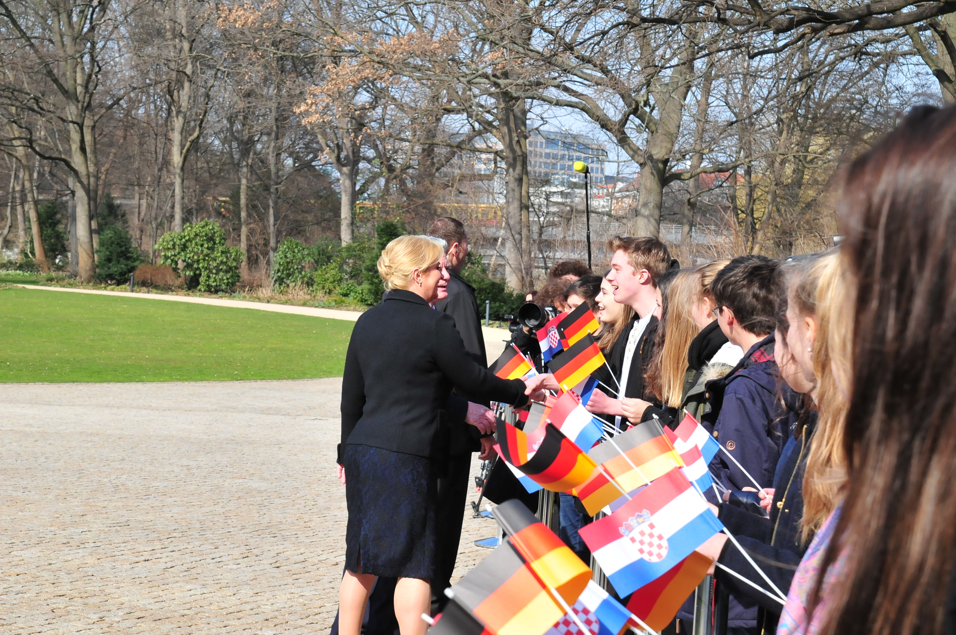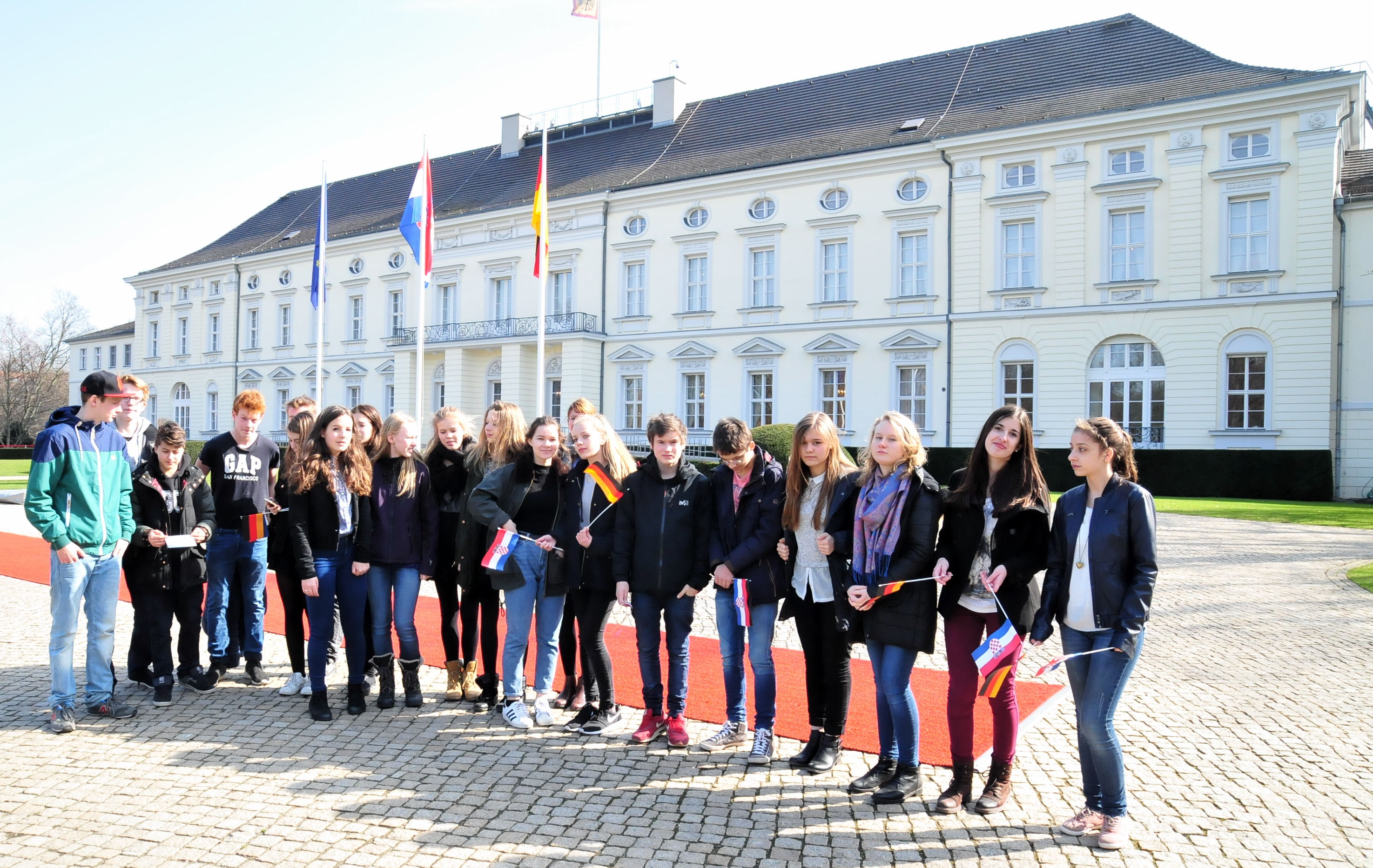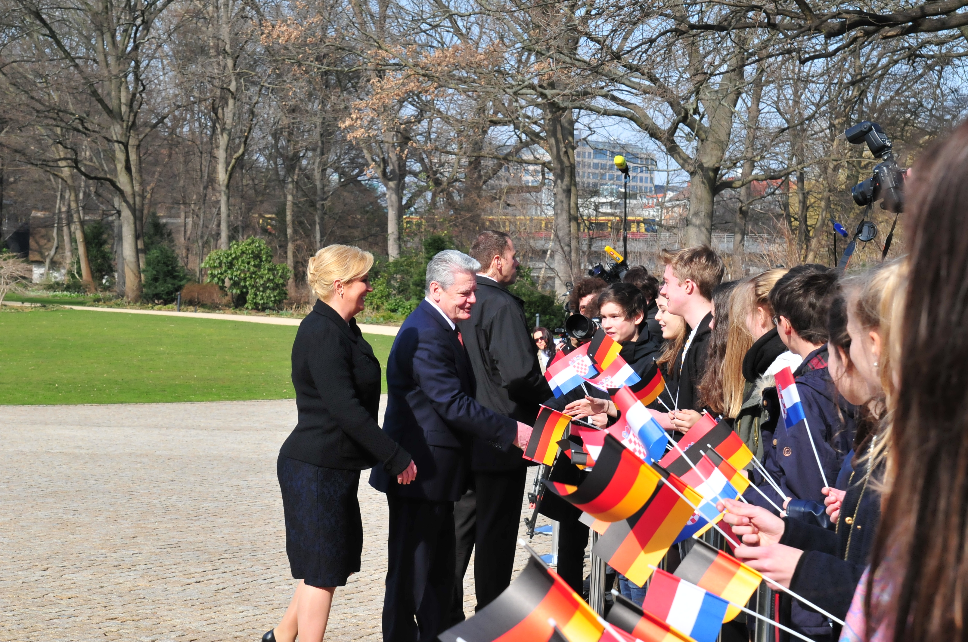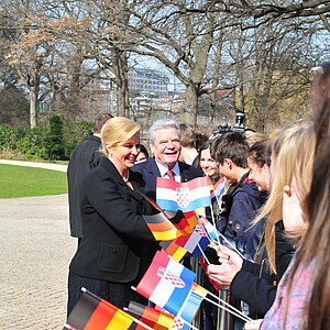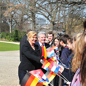 Am 17. März 2015 hatte die Klasse 9b die Gelegenheit, dem Empfang der Präsidentin Kroatiens durch den Bundespräsidenten mit militärischen Ehren im Park des Schlosses Bellevue beizuwohnen. Nach einer kurzen Information durch die für das Protokoll zuständige Mitarbeiterin im Bundespräsidialamt konnten wir das protokollarisch höchste Zeremoniell beobachten. Anschließend schüttelten uns Frau Kolinda Grabar-Kitarovic und Joachim Gauck die Hände. Zum Abschluss gab es noch ein Foto vor dem Roten Teppich.