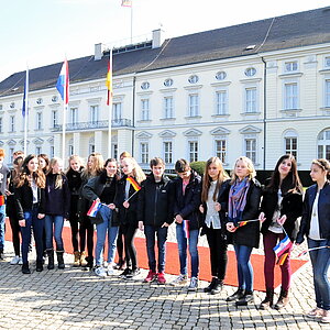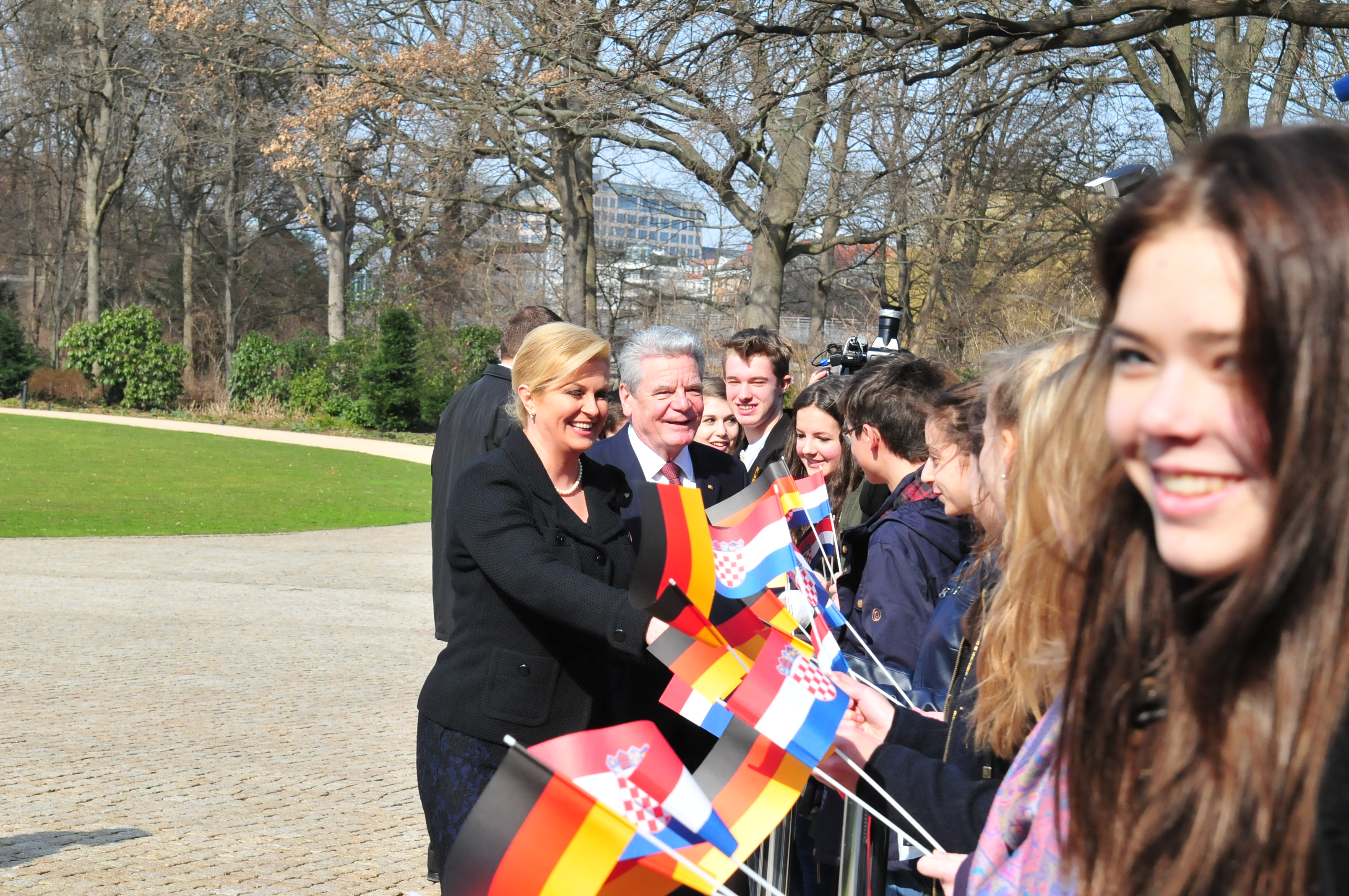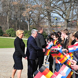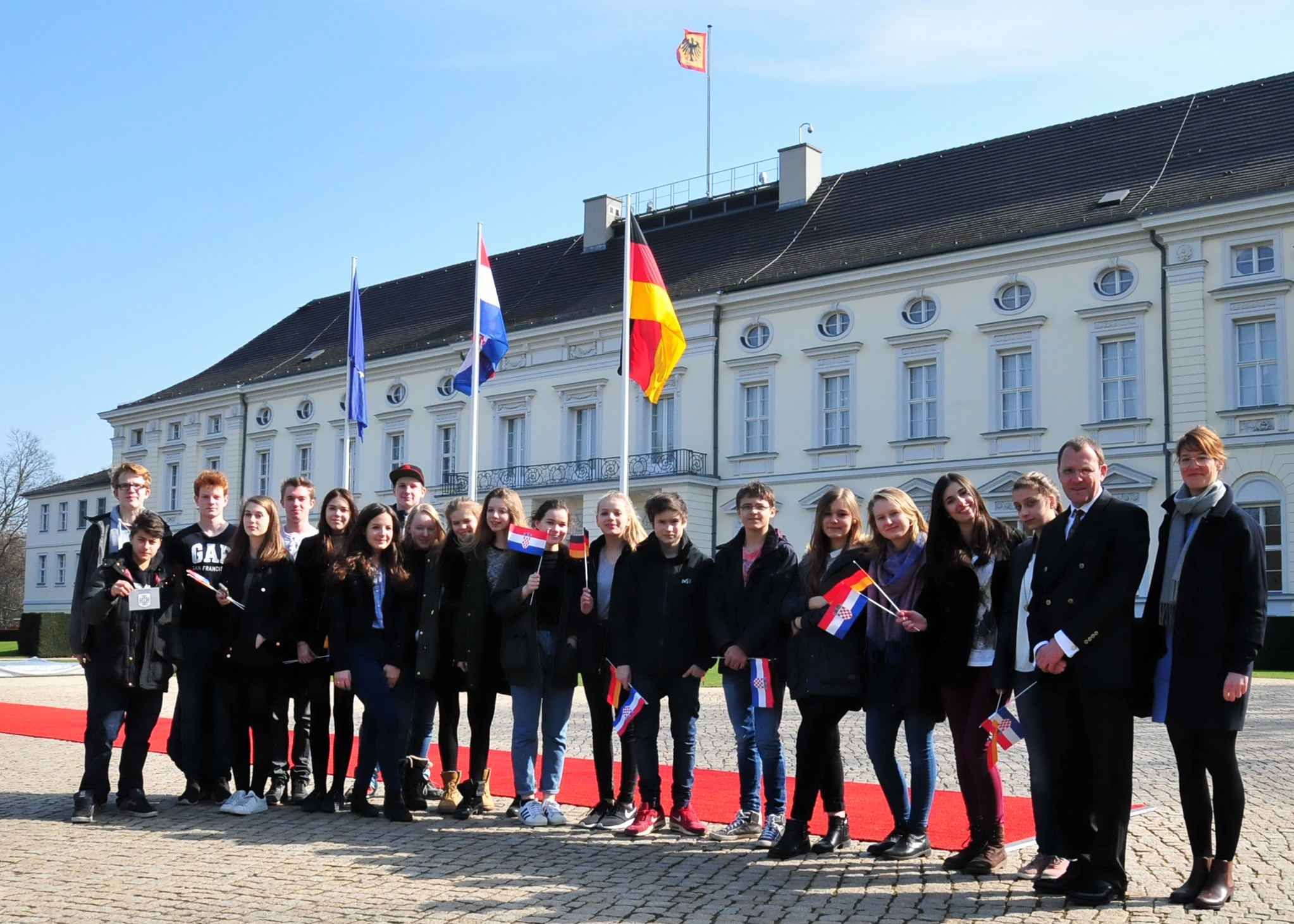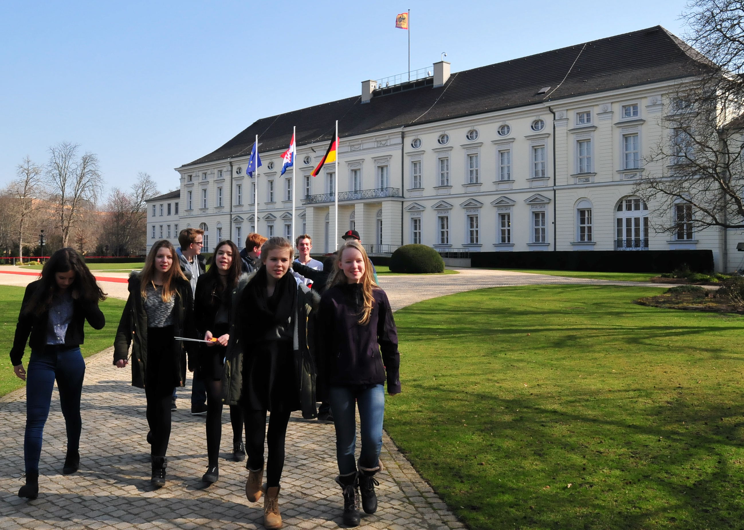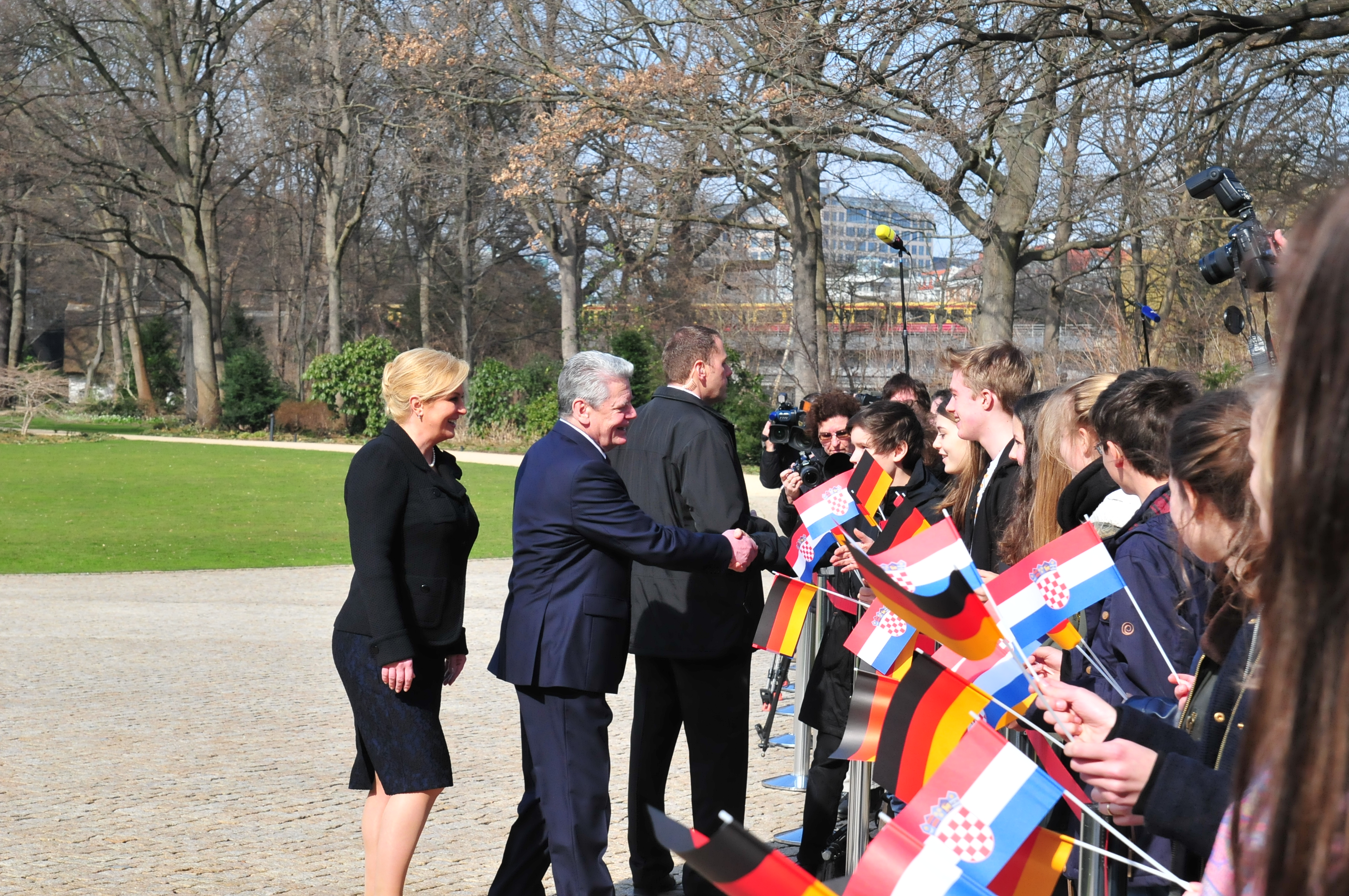 Am 17. März 2015 hatte die Klasse 9b die Gelegenheit, dem Empfang der Präsidentin Kroatiens durch den Bundespräsidenten mit militärischen Ehren im Park des Schlosses Bellevue beizuwohnen. Nach einer kurzen Information durch die für das Protokoll zuständige Mitarbeiterin im Bundespräsidialamt konnten wir das protokollarisch höchste Zeremoniell beobachten. Anschließend schüttelten uns Frau Kolinda Grabar-Kitarovic und Joachim Gauck die Hände. Zum Abschluss gab es noch ein Foto vor dem Roten Teppich.