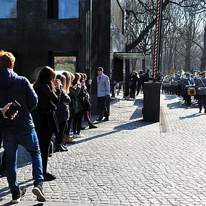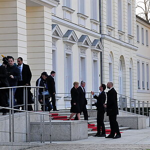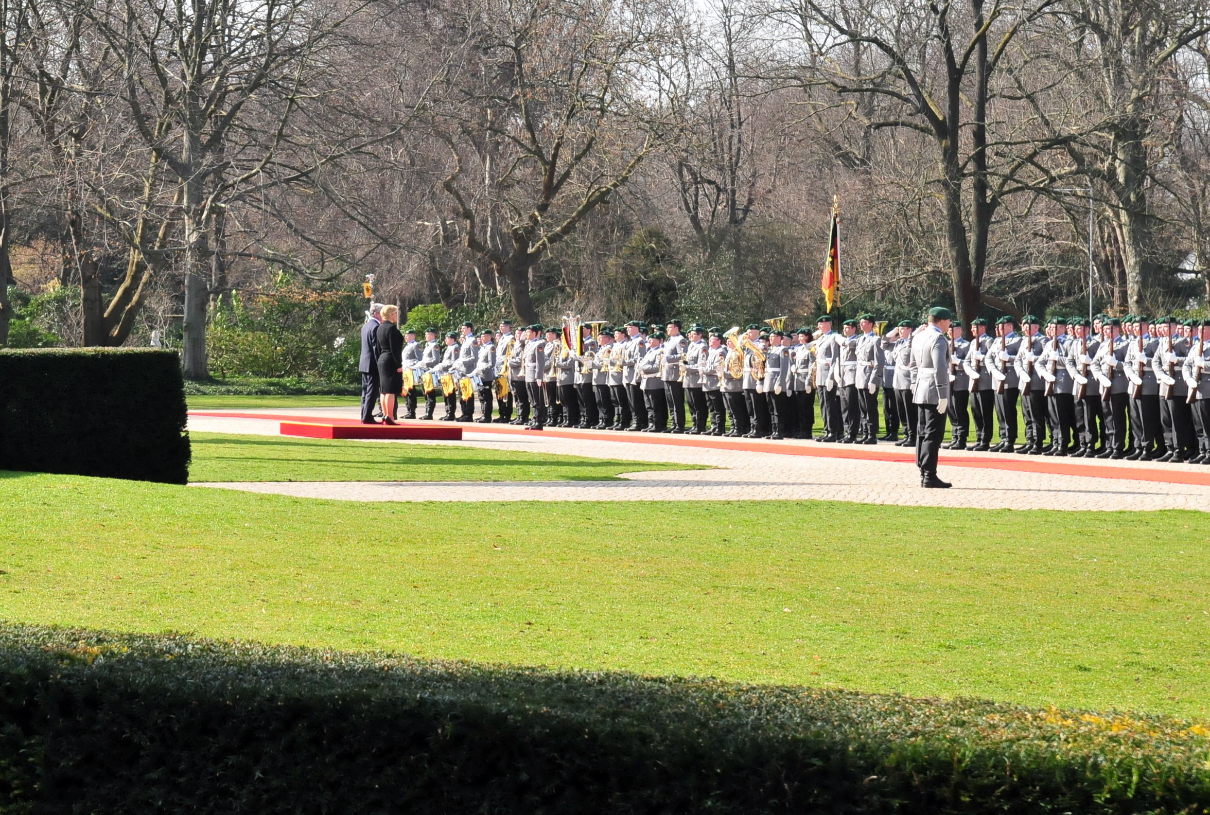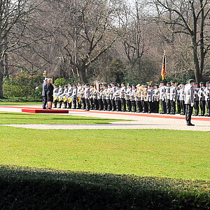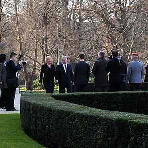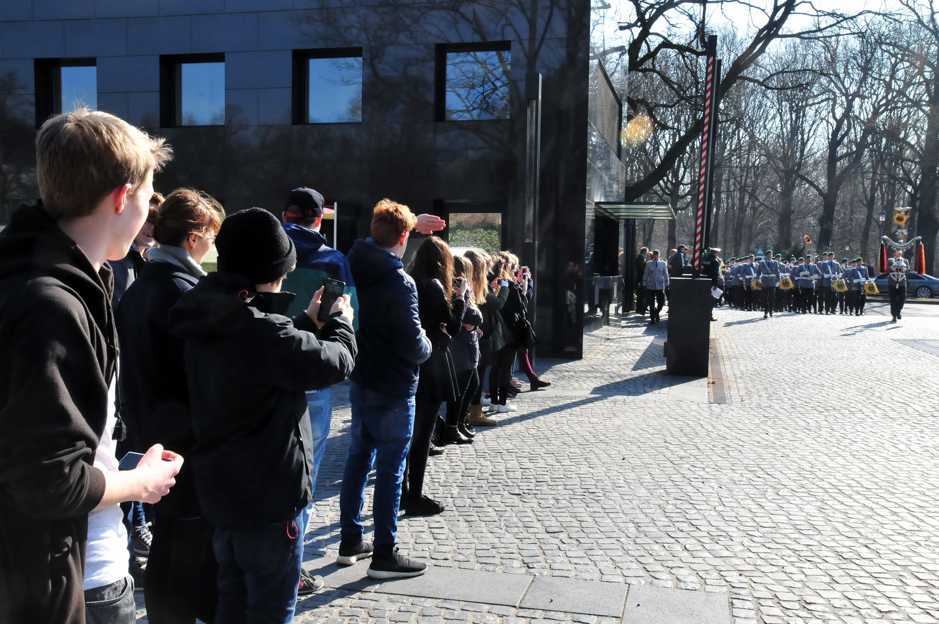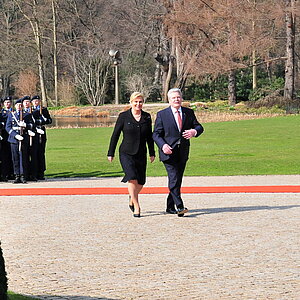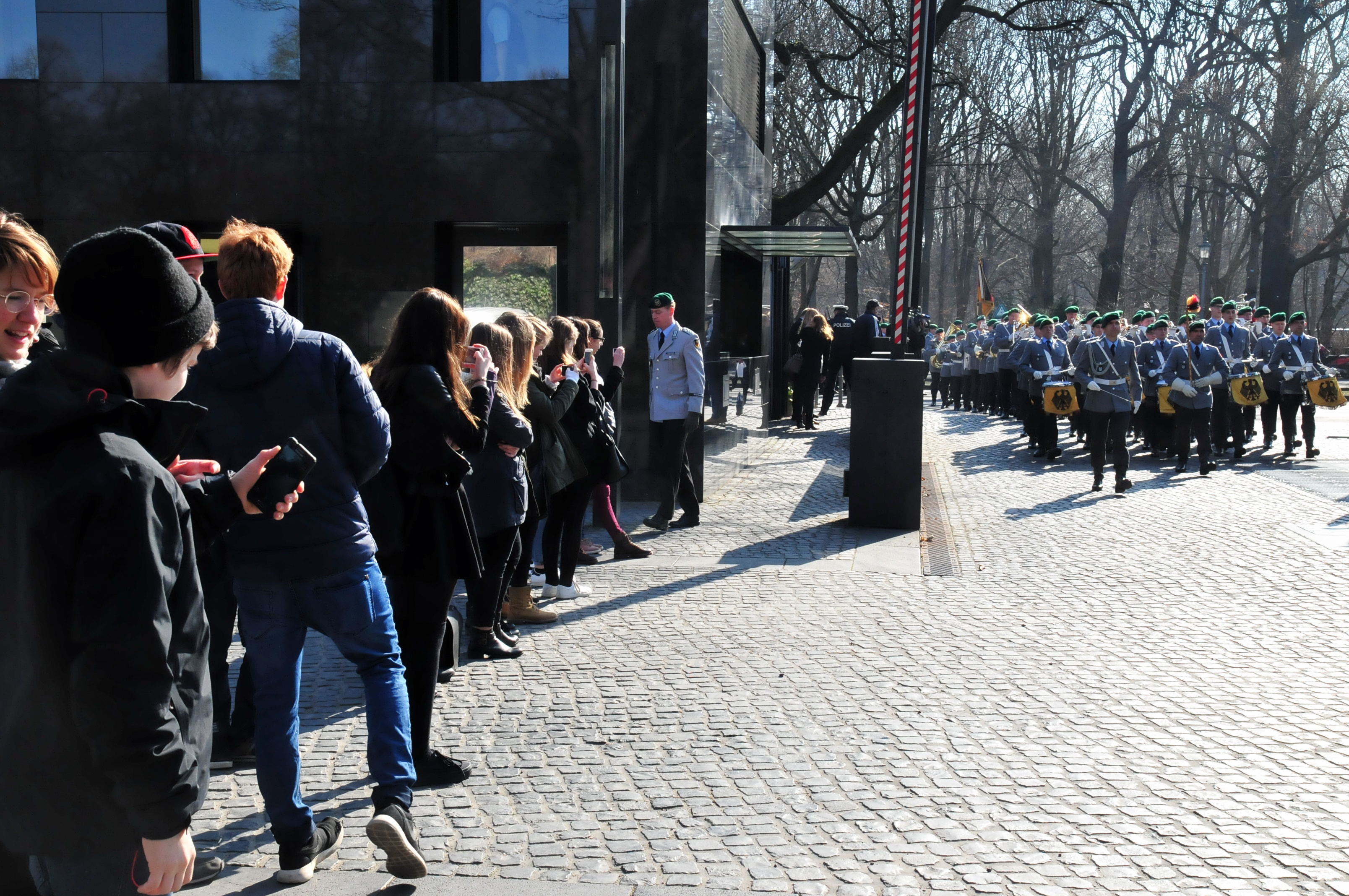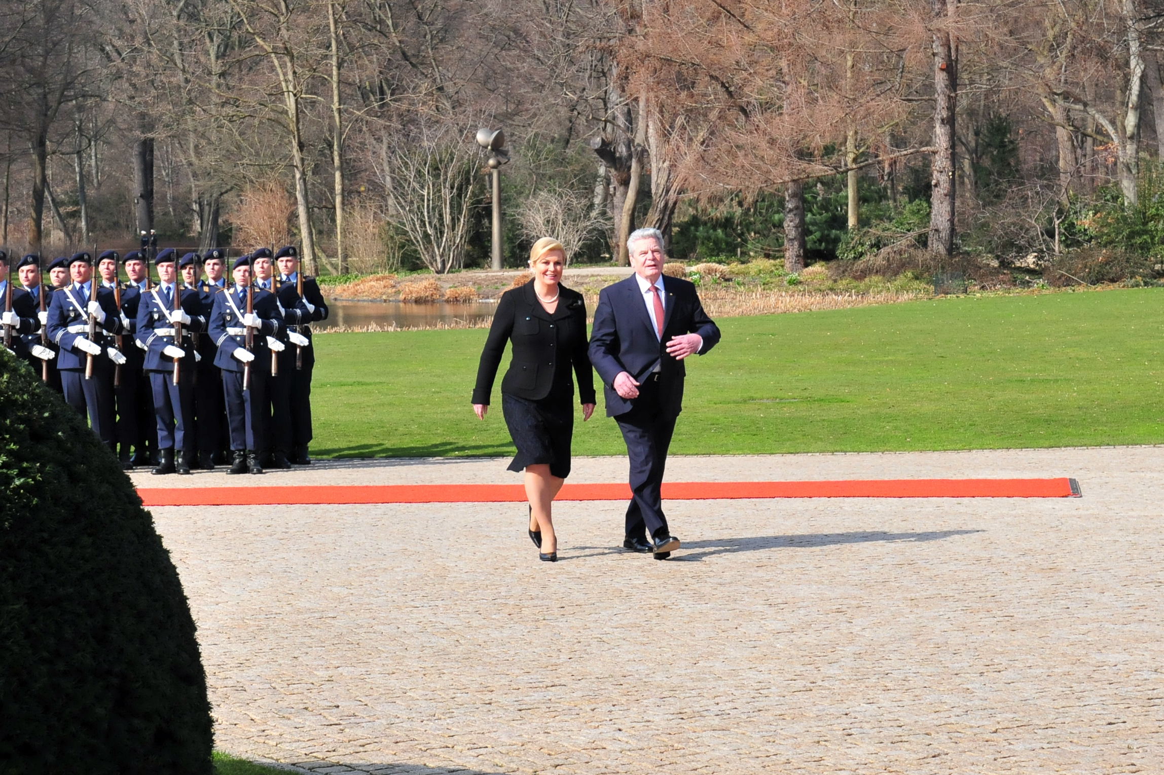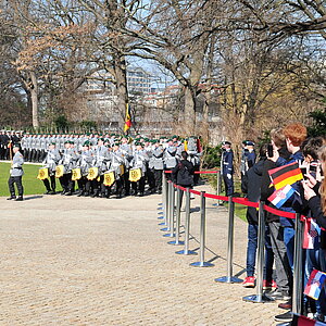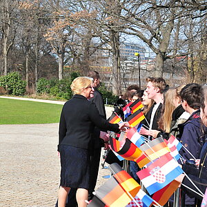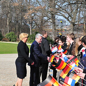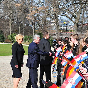 Am 17. März 2015 hatte die Klasse 9b die Gelegenheit, dem Empfang der Präsidentin Kroatiens durch den Bundespräsidenten mit militärischen Ehren im Park des Schlosses Bellevue beizuwohnen. Nach einer kurzen Information durch die für das Protokoll zuständige Mitarbeiterin im Bundespräsidialamt konnten wir das protokollarisch höchste Zeremoniell beobachten. Anschließend schüttelten uns Frau Kolinda Grabar-Kitarovic und Joachim Gauck die Hände. Zum Abschluss gab es noch ein Foto vor dem Roten Teppich.