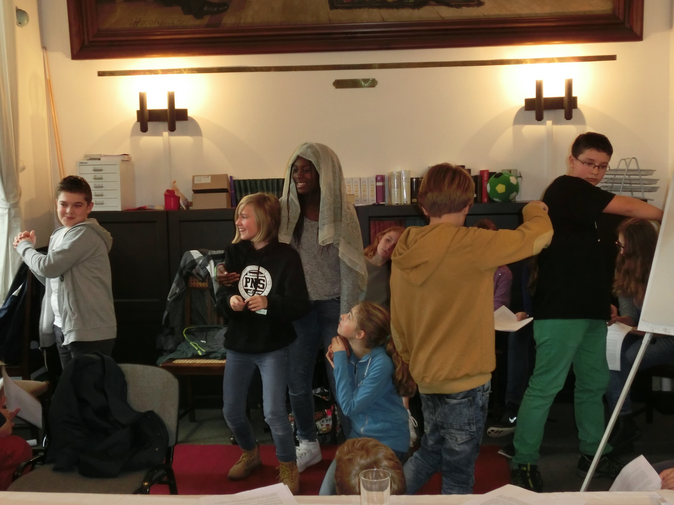 Unsere Schüler_innen überlegten sich in kleinen Arbeitsgruppen Standbilder zu den vielfältigen Situationen auf einer Flucht, um sich in die Gefühle, Wünsche und Hoffnungen der Menschen hineinzuversetzen. Diese stellten sie den Zuschauern vor und beantworteten deren Fragen. Es entwickelten sich Gespräche mit großer Ernsthaftigkeit und Mitgefühl.