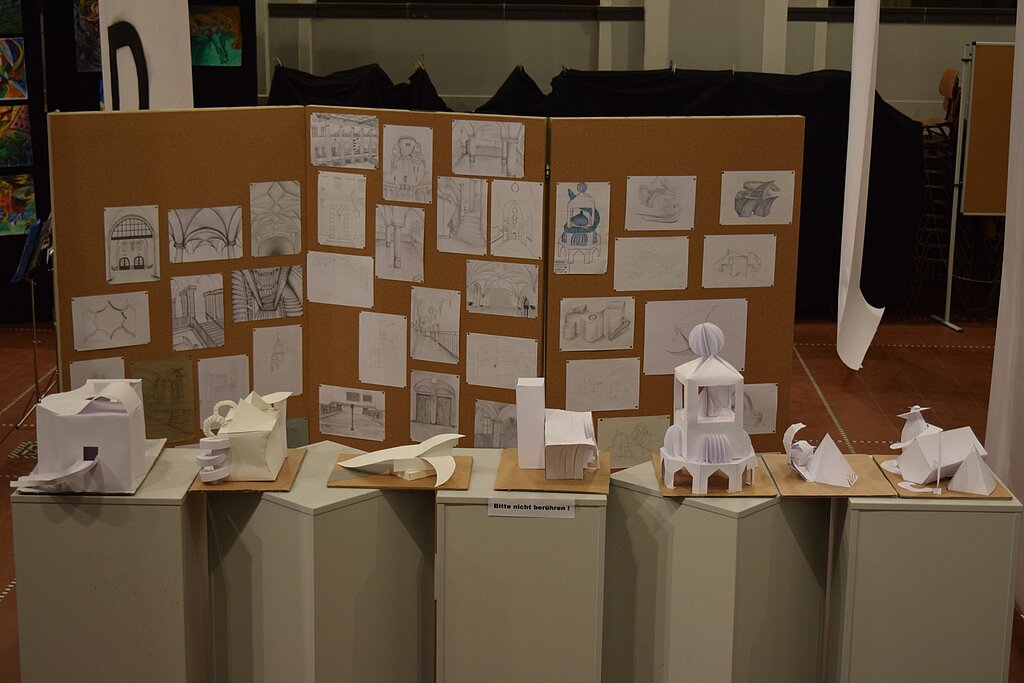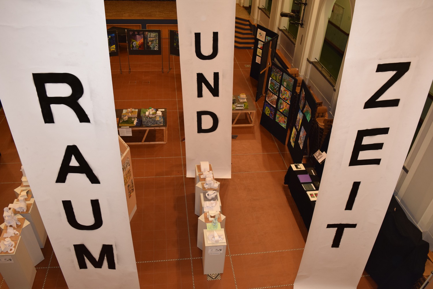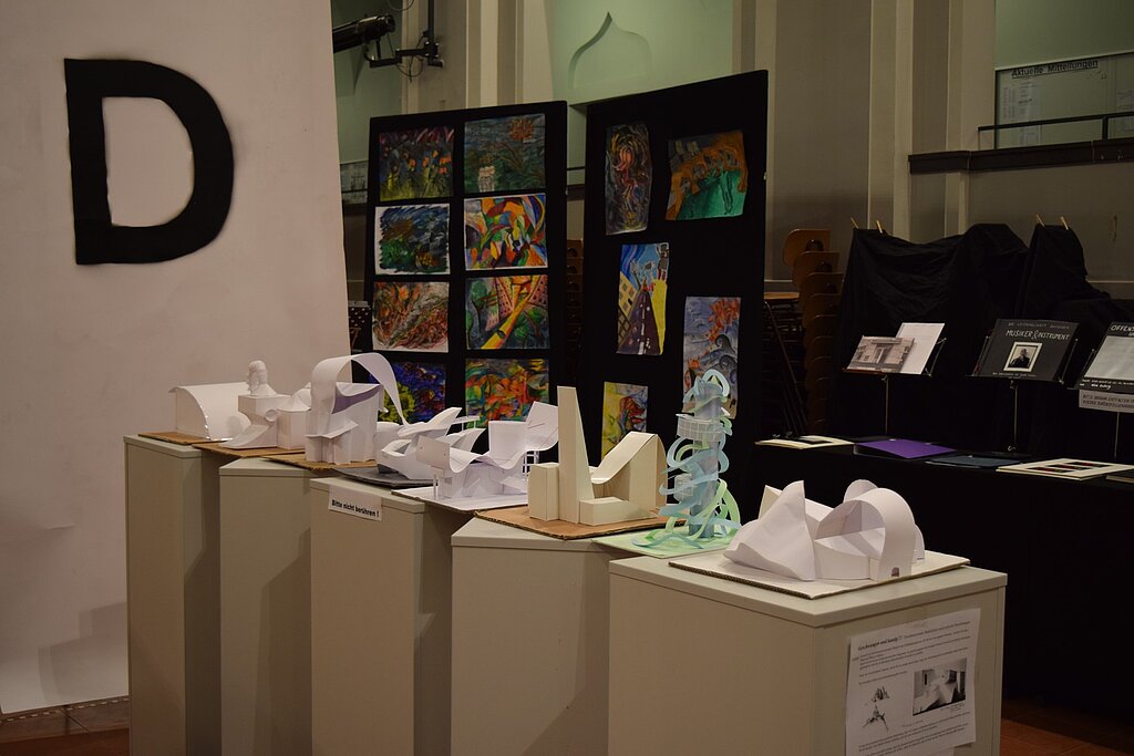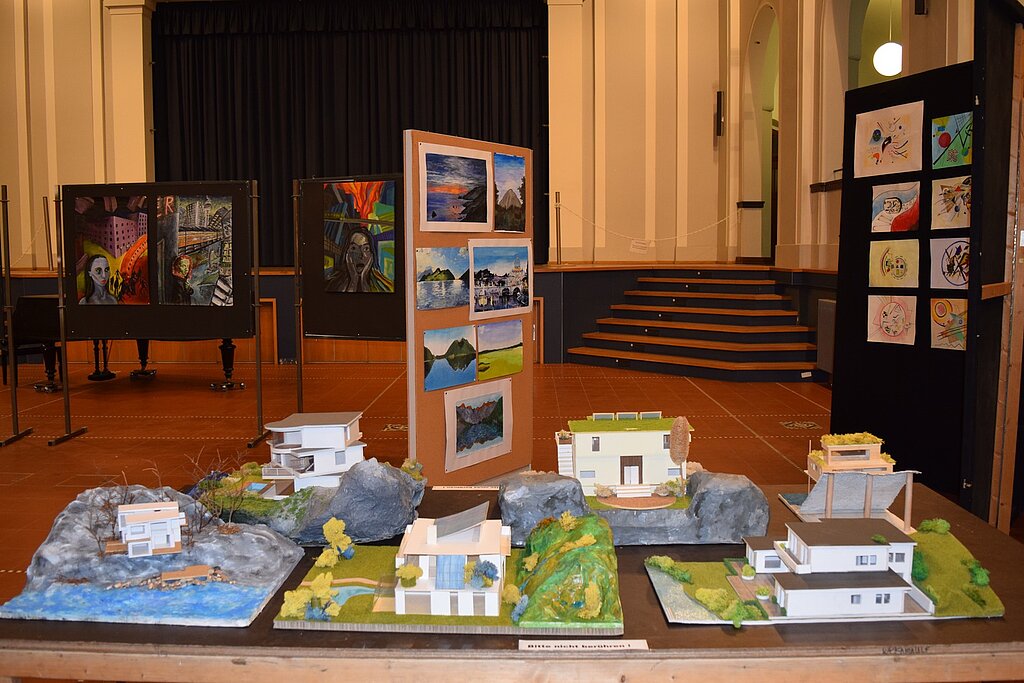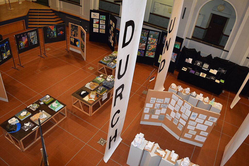 Unter dem von den SchülerInnen entwickelten Motto "Kunst durch Raum und Zeit" präsentierten sie die Vielzahl ihrer in den 4 Semestern entstandenen Werke wie Fotografien, Architekturzeichnungen und architektonische Modelle, Zeichnungen und Malereien in der Aula. Mit der Form ihrer Präsentation schufen sie für eine Woche im März 2016 eine neue räumliche Wahrnehmung des großen Atriums. - Dies war ein wahrlich krönender Abschluss des Leistungskurses!!!