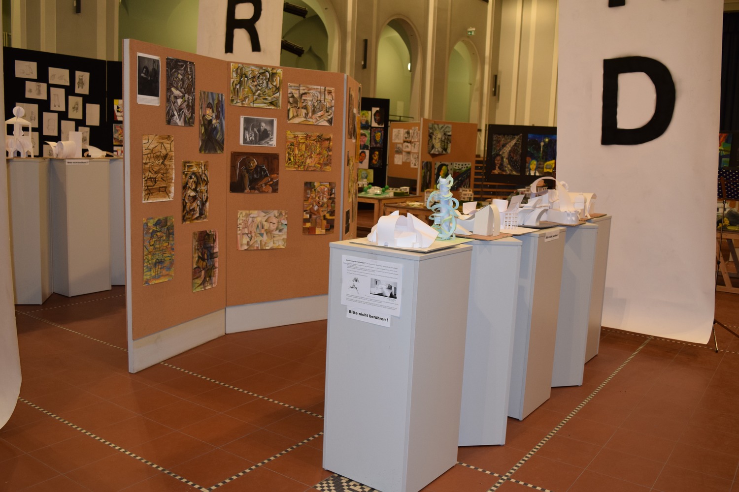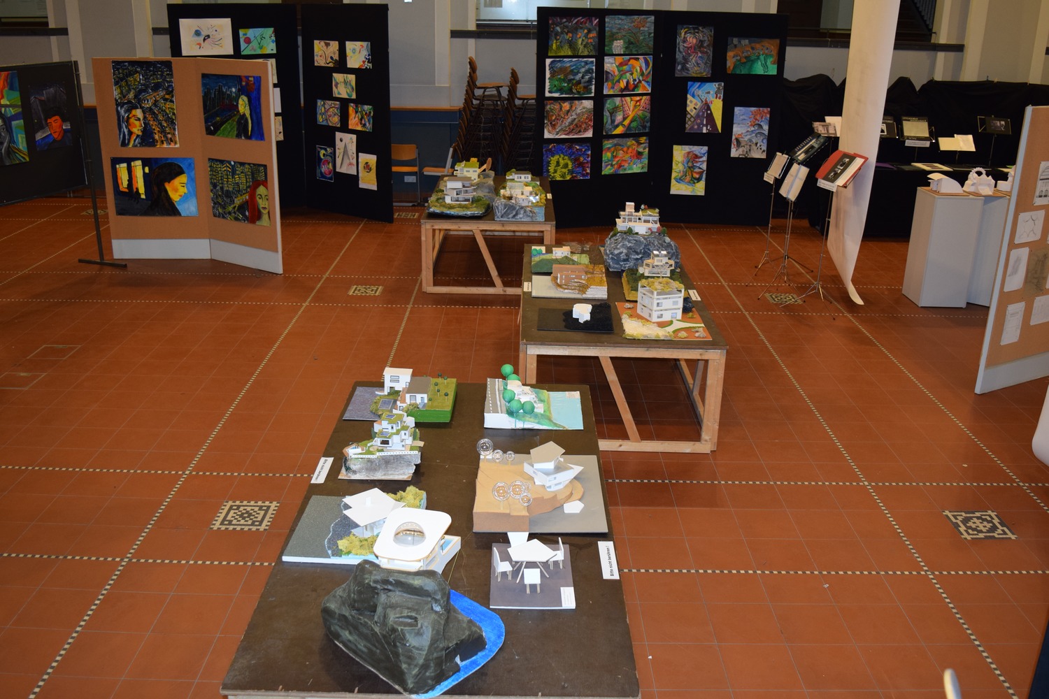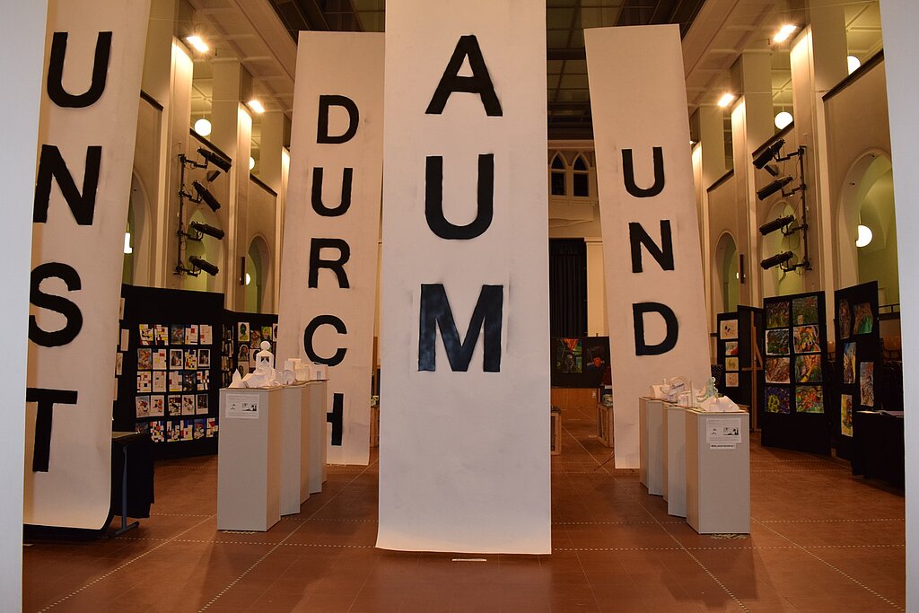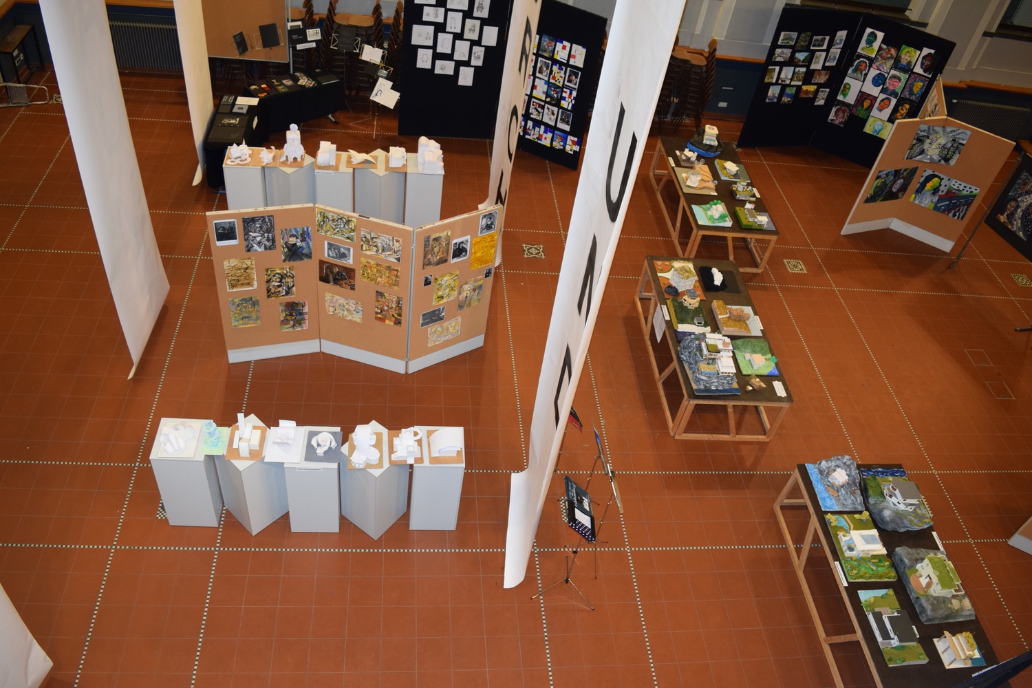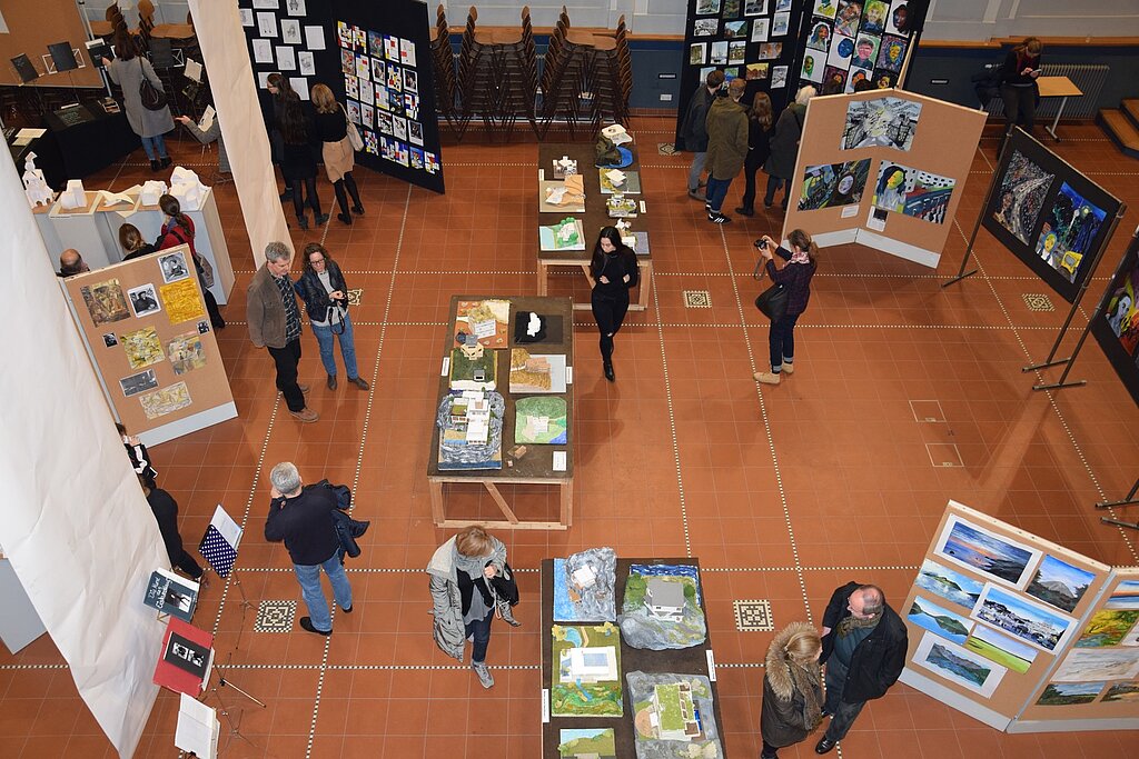Unter dem von den SchülerInnen entwickelten Motto "Kunst durch Raum und Zeit" präsentierten sie die Vielzahl ihrer in den 4 Semestern entstandenen Werke wie Fotografien, Architekturzeichnungen und architektonische Modelle, Zeichnungen und Malereien in der Aula. Mit der Form ihrer Präsentation schufen sie für eine Woche im März 2016 eine neue räumliche Wahrnehmung des großen Atriums. - Dies war ein wahrlich krönender Abschluss des Leistungskurses!!!
