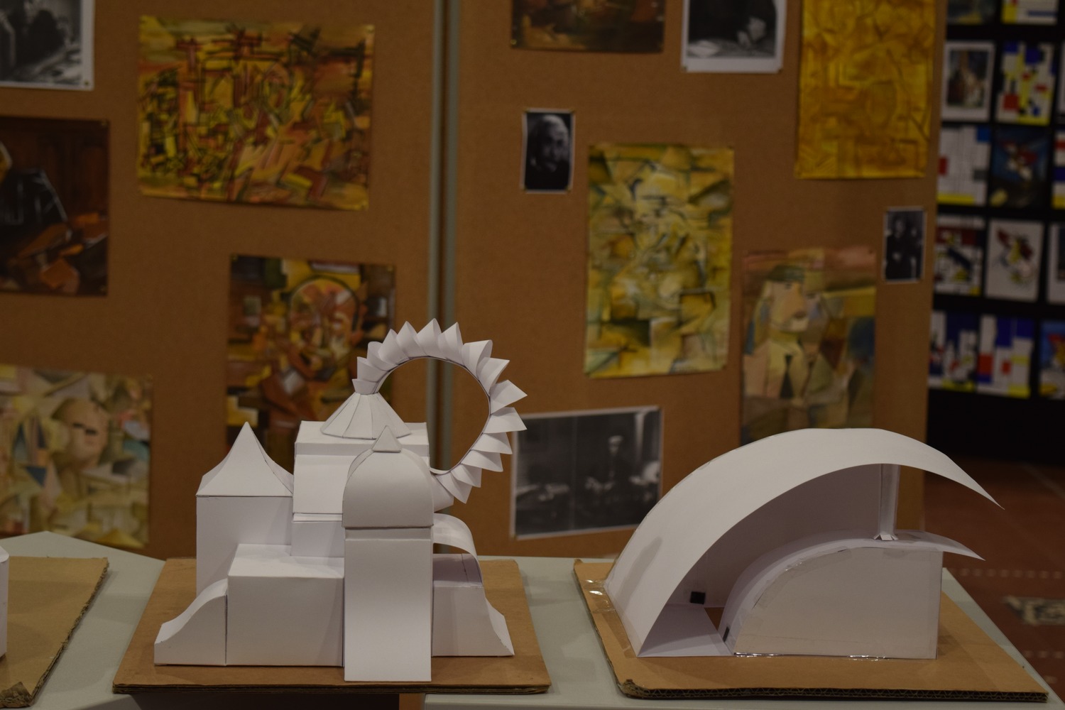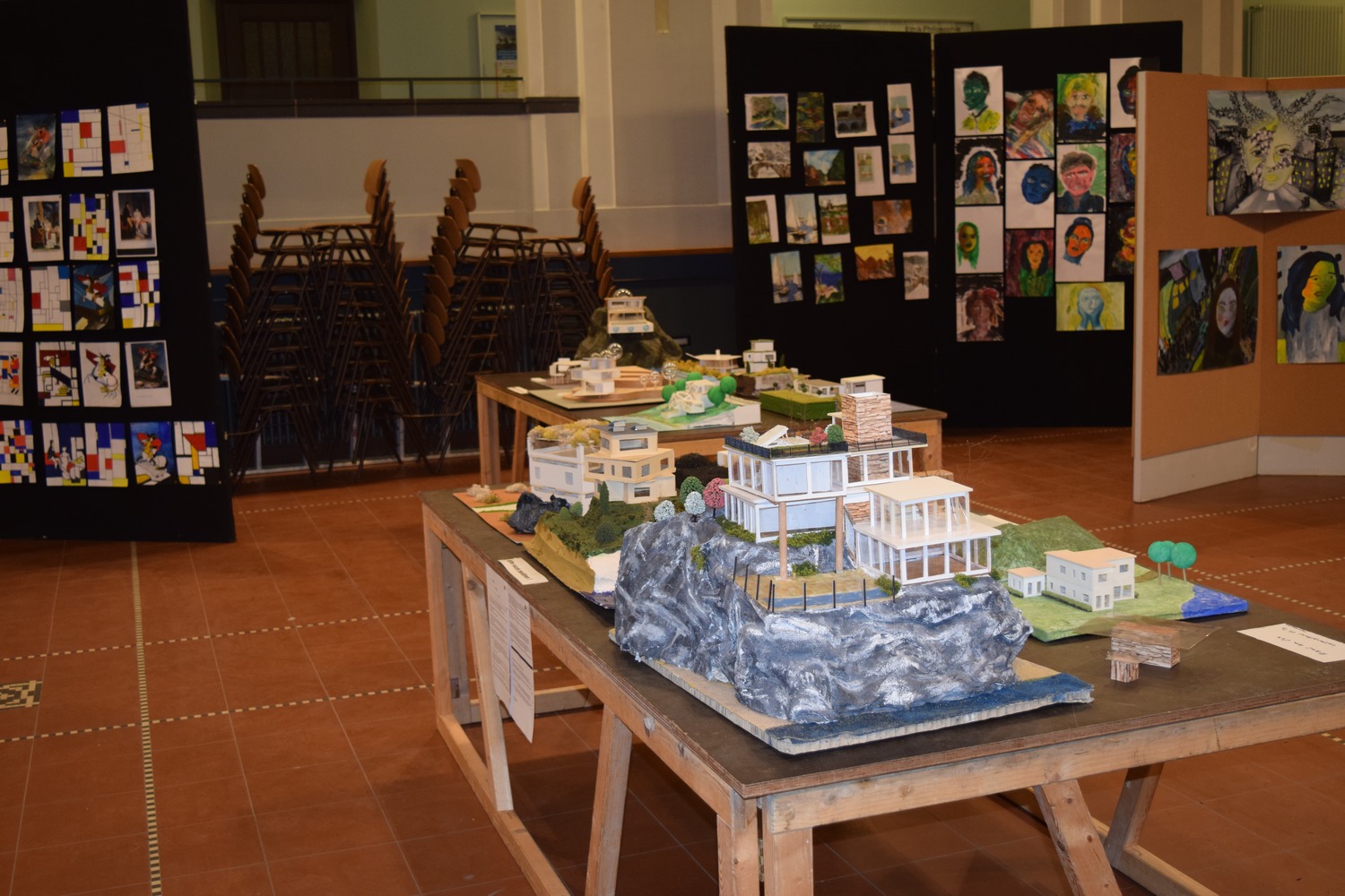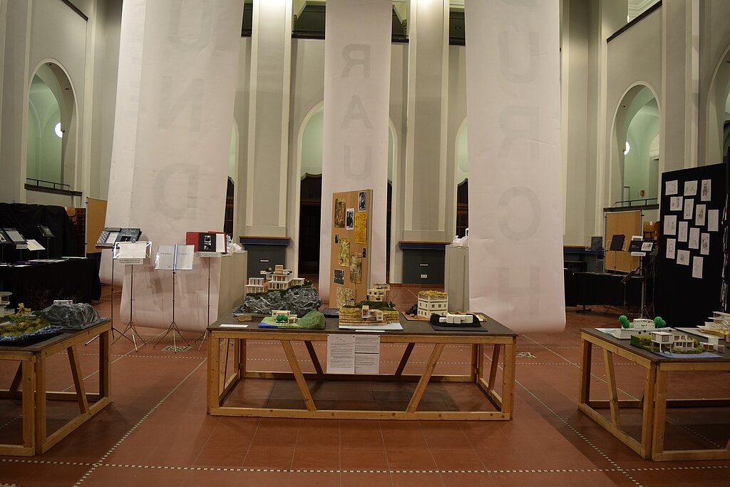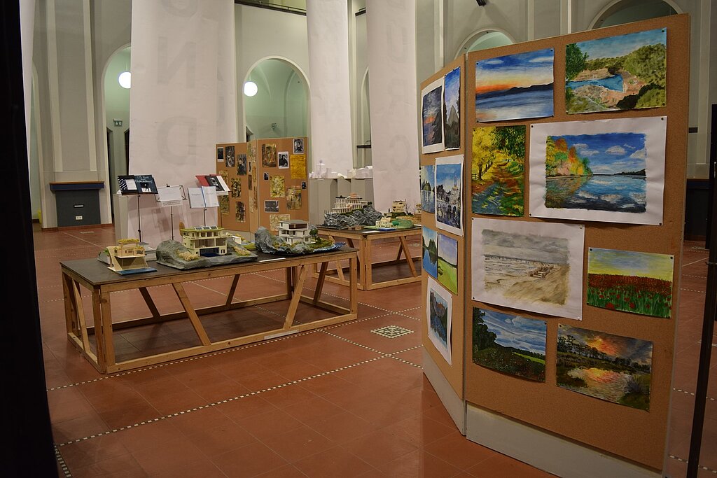 Unter dem von den SchülerInnen entwickelten Motto "Kunst durch Raum und Zeit" präsentierten sie die Vielzahl ihrer in den 4 Semestern entstandenen Werke wie Fotografien, Architekturzeichnungen und architektonische Modelle, Zeichnungen und Malereien in der Aula. Mit der Form ihrer Präsentation schufen sie für eine Woche im März 2016 eine neue räumliche Wahrnehmung des großen Atriums. - Dies war ein wahrlich krönender Abschluss des Leistungskurses!!!