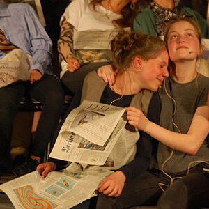Das Großprojekt wurde von der Ton- und der Lichttechnik-AG so souverän begleitet, dass alle Darsteller_innen und Musiker_innen wie auf einer professionellen Theaterbühne agieren konnten. Die äußerst atmosphärischen Fotos des Leistungskurses Kunst verzauberten die Aula und versetzten das Publikum zurück in die 80er Jahre und in die U-Bahnhöfe entlang der tatsächlichen Linie 1.