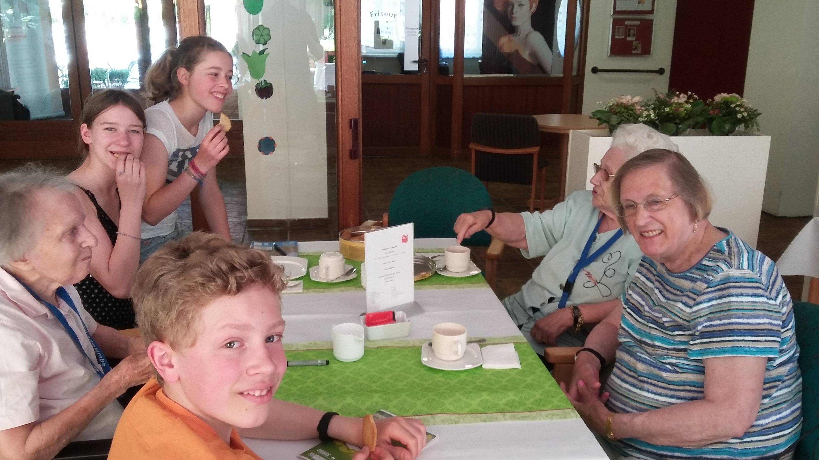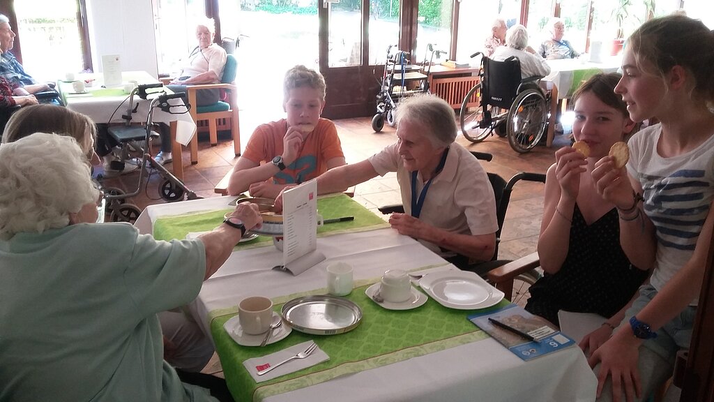 Die Exkursion begann damit, dass die Schülerinnen und Schüler einen Mitarbeiter des Sozialdienstes interviewten. Darin kam zum Ausdruck, dass die wenige Zeit mit einzelnen Mitbewohner_innen für ihn tatsächlich ein Konflikt darstellt. Nichtsdestotrotz gebe es im Alltag des Seniorenheims aber immer wieder auch Inseln der Begegnung, sei es beim Spaziergang oder beim gemeinsamen Singen. Die Schülerinnen und Schüler konnten in den kommenden Stunden beides erfahren. Zunächst besuchten sie einzelne Bewohner_innen in ihren Zimmern und begleiteten sie zum Kaffeetrinken. Beeindruckt waren einige Schülerinnen und Schüler von der teilweise fürstlichen Einrichtung mancher Zimmer. Etwas traurig zeigten sich Schülerinnen, die eine gewisse Zeit mit demenzkranken Bewohner_innen verbrachten. Besonders lustig fand eine andere Schülerin, dass alle Bewohner_innen, mit denen sie gesprochen hat, die Serie "Auf Streife" schauten. "Ein bisschen mulmig" beschrieb eine Schülerin ihr Gefühl, als sie den fensterlosen Sterberaum besichtigte, in dem nur eine Liege stand. Abgeschlossen wurde dieser erlebnisreiche Ausflug mit einem gemeinsamen Singen. Die Schülerinnen und Schüler sangen zusammen mit den Mitbewohner_innen Schlager und trugen solistisch ihre Lieblings-Popsongs vor.