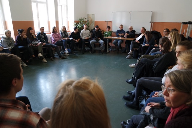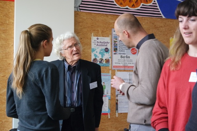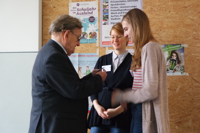 Die 11. und 12. Klasse hingegen blieben in der Schule und führten Gespräche mit Zeitzeugen aus der DDR und der NS-Zeit. Da wir erstmals zeitgleich acht verschiedene Zeitzeugen im Hause hatten, wurden sie von einem "Host" begleitet. So standen den Referenten immer ein Schüler oder eine Schülerin als Ansprechpartner zur Seite.