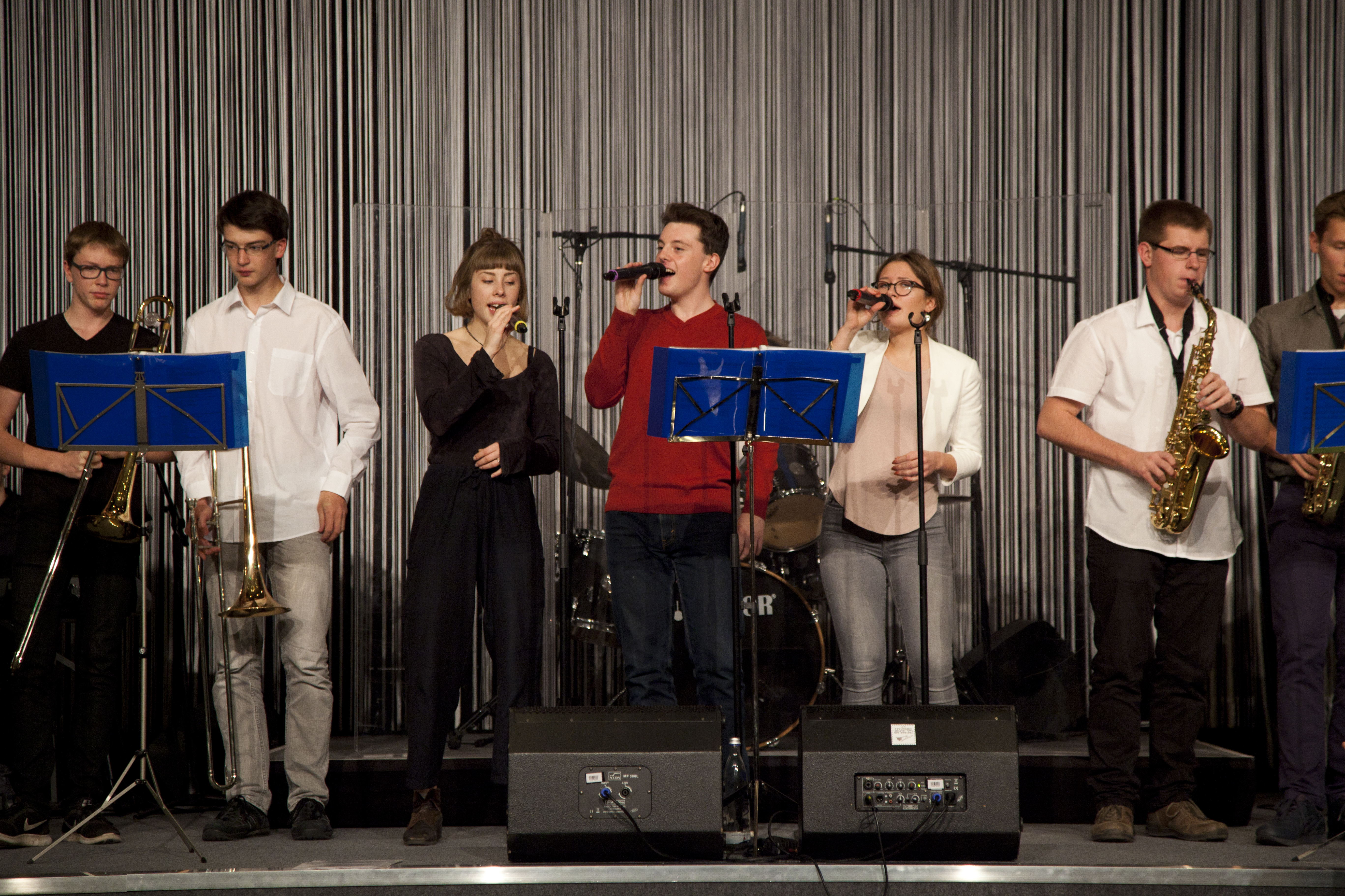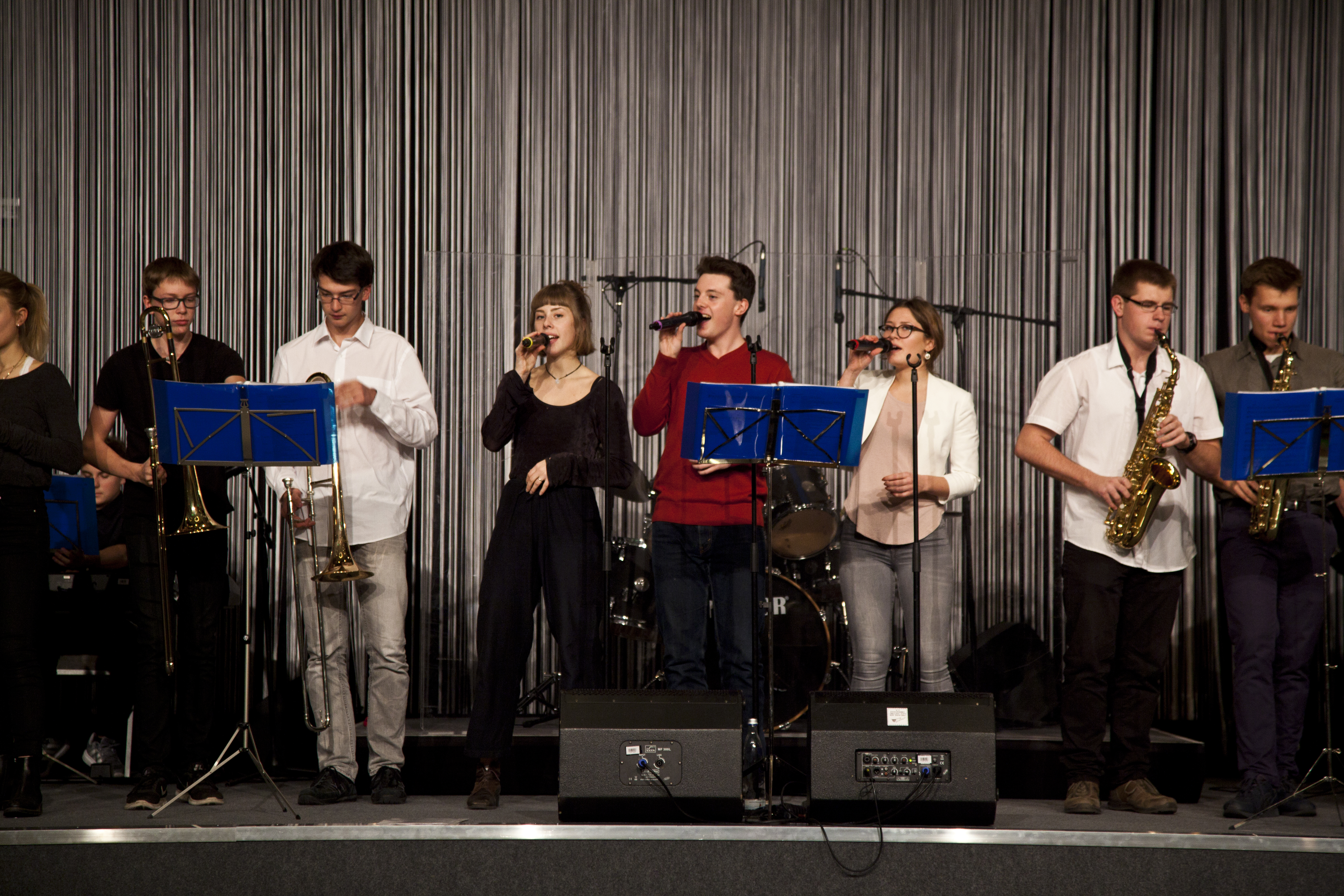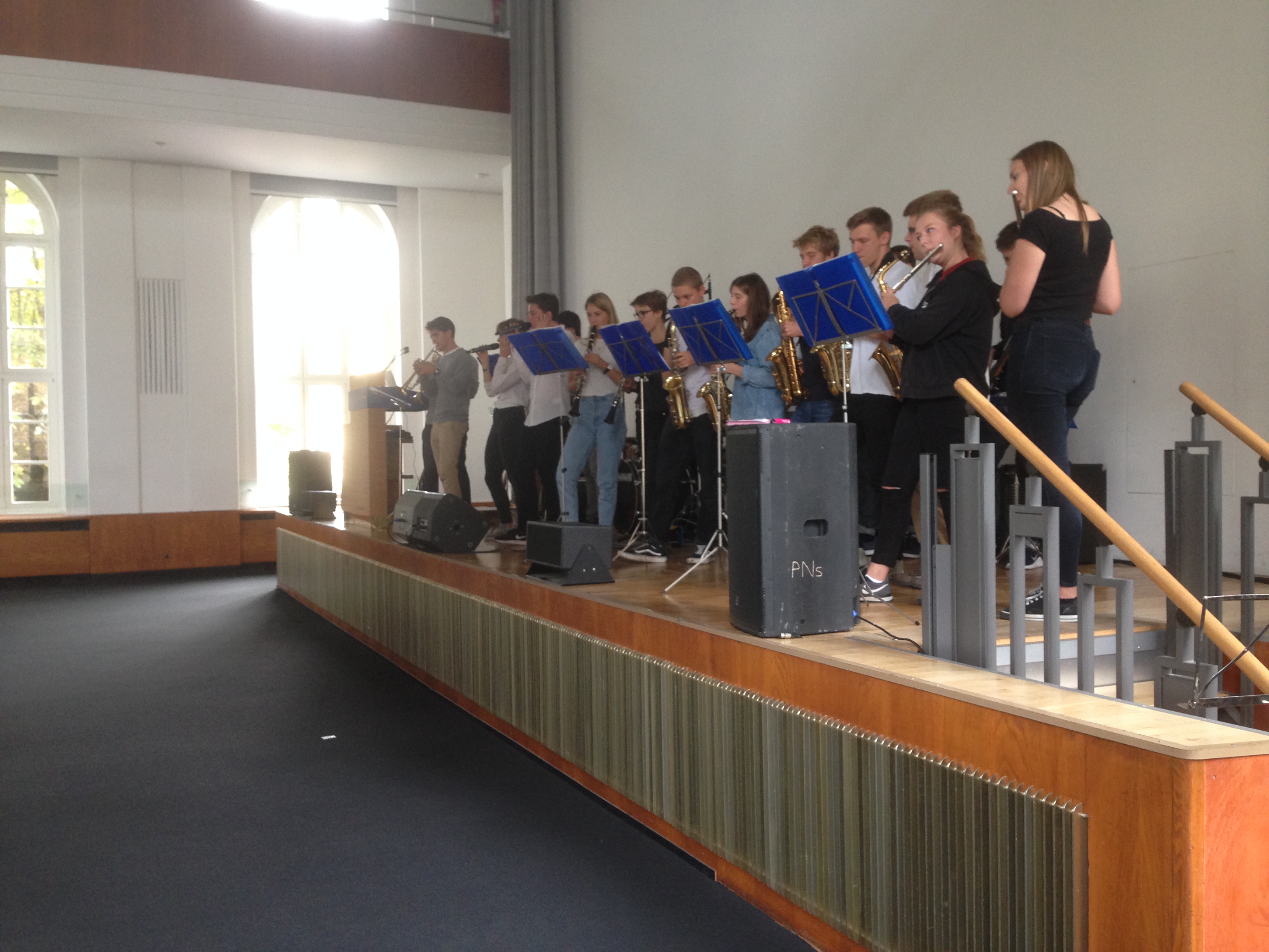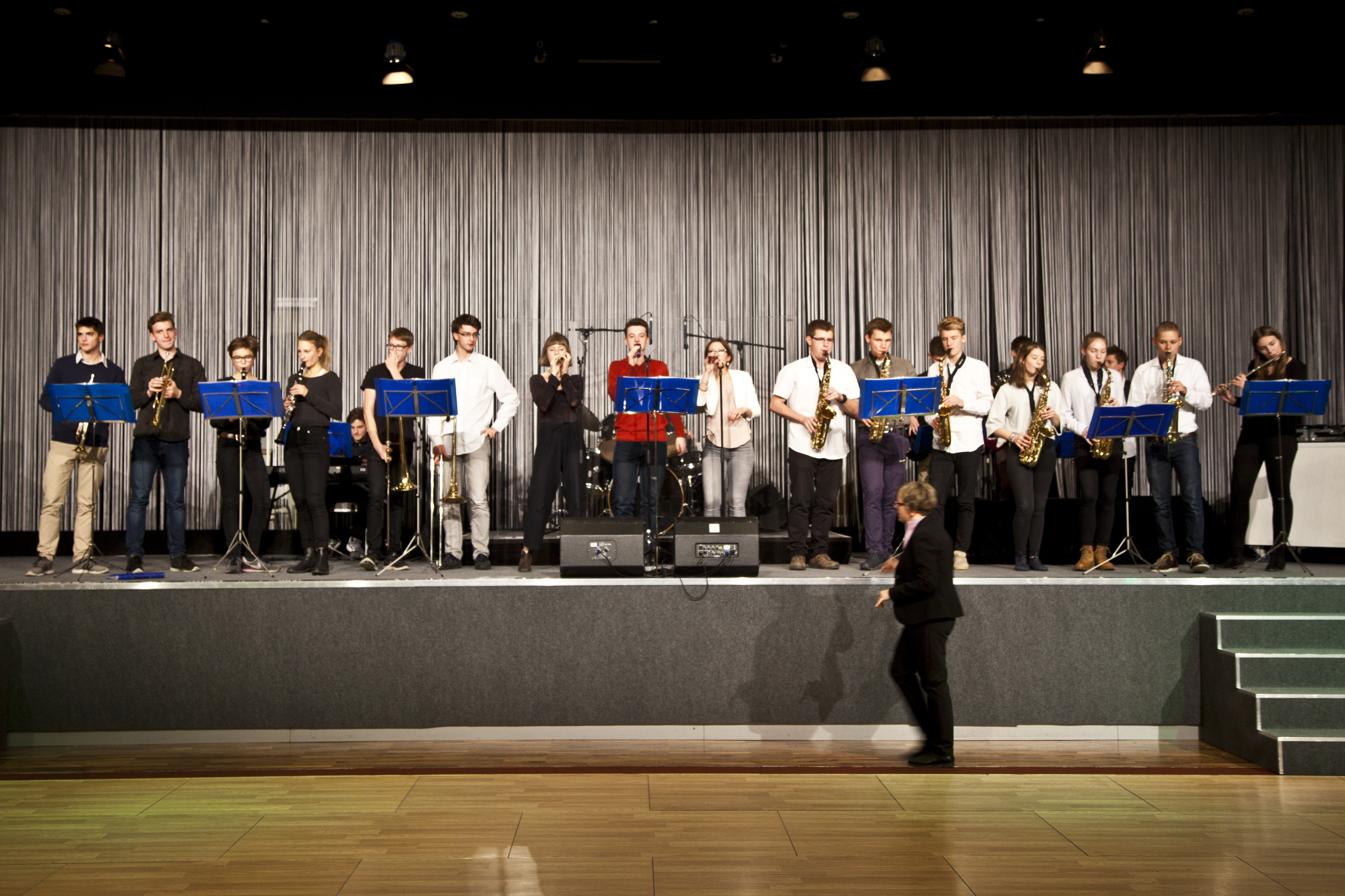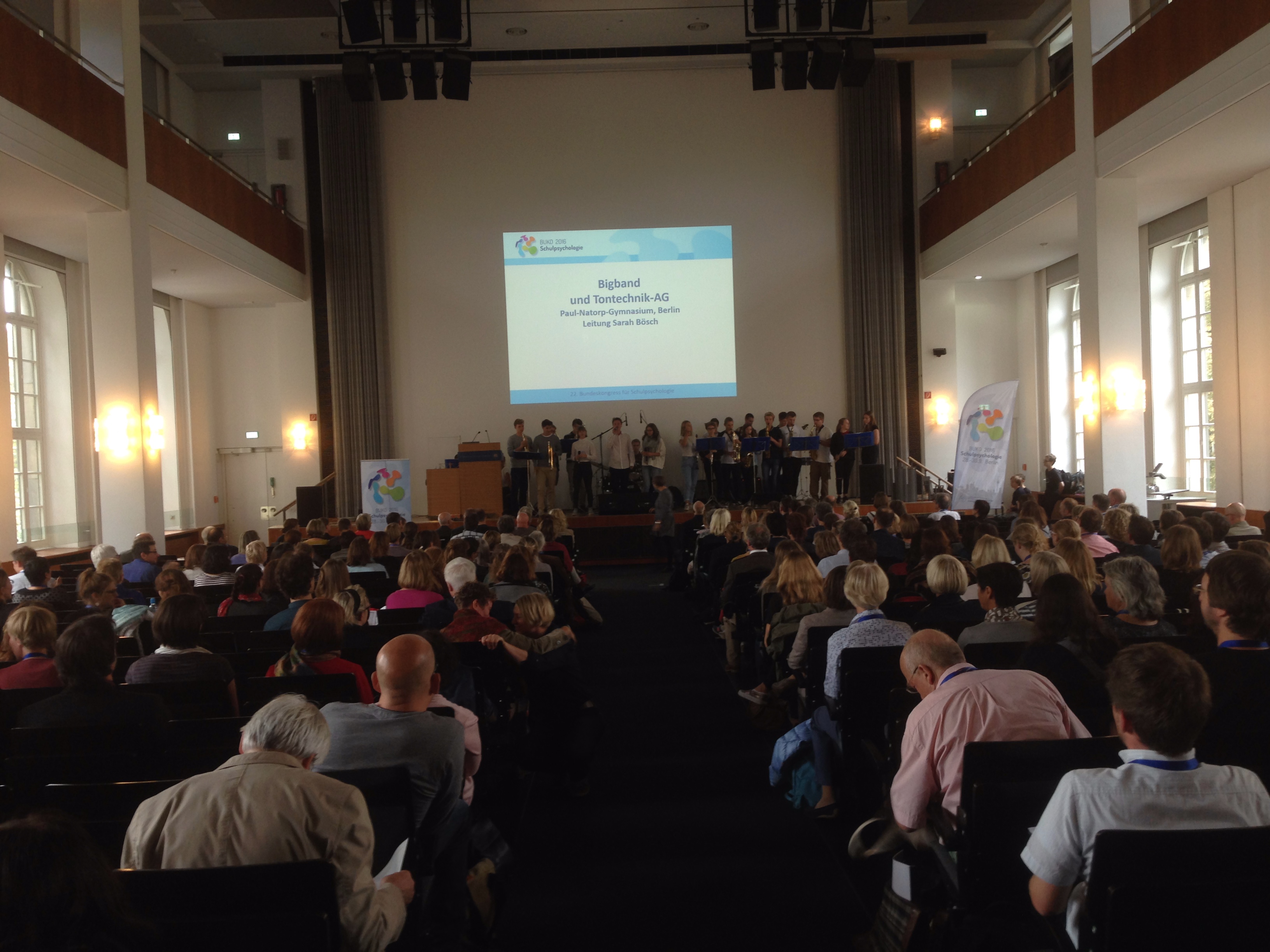 Am 28.9.2016 hatten unsere Big Band- und Tontechnik-AG die Gelegenheit, den 22. Bundeskongress für Schulpsychologie im Audimax der Humboldt-Universität zu Berlin zu eröffnen. Das Publikum ließ sich von den tontechnisch professionell abgemischten Klängen unserer Musikerinnen und Musiker mitreißen, wie man nicht zuletzt am begeisterten Mitklatschen zu dem mittlerweile schon legendären Song „Rolling in the deep“ von Adele ablesen konnte. Am 12.11.2016 folgte dann bereits der zweite externe Auftritt unserer beiden Arbeitsgemeinschaften im Hotel Estrel. Der Berliner Elternverein „Zukunftssicherung e.V.“, der Menschen mit geistiger Behinderung fördert, hatte unsere Big Band zur musikalischen Begleitung seines Jubiläumsballs „30 Jahre Ahornallee“ eingeladen. Ein für uns ungewöhnlicher, aber toller Anblick: Es wurde die ganze Zeit mitgesungen und vor allem getanzt!