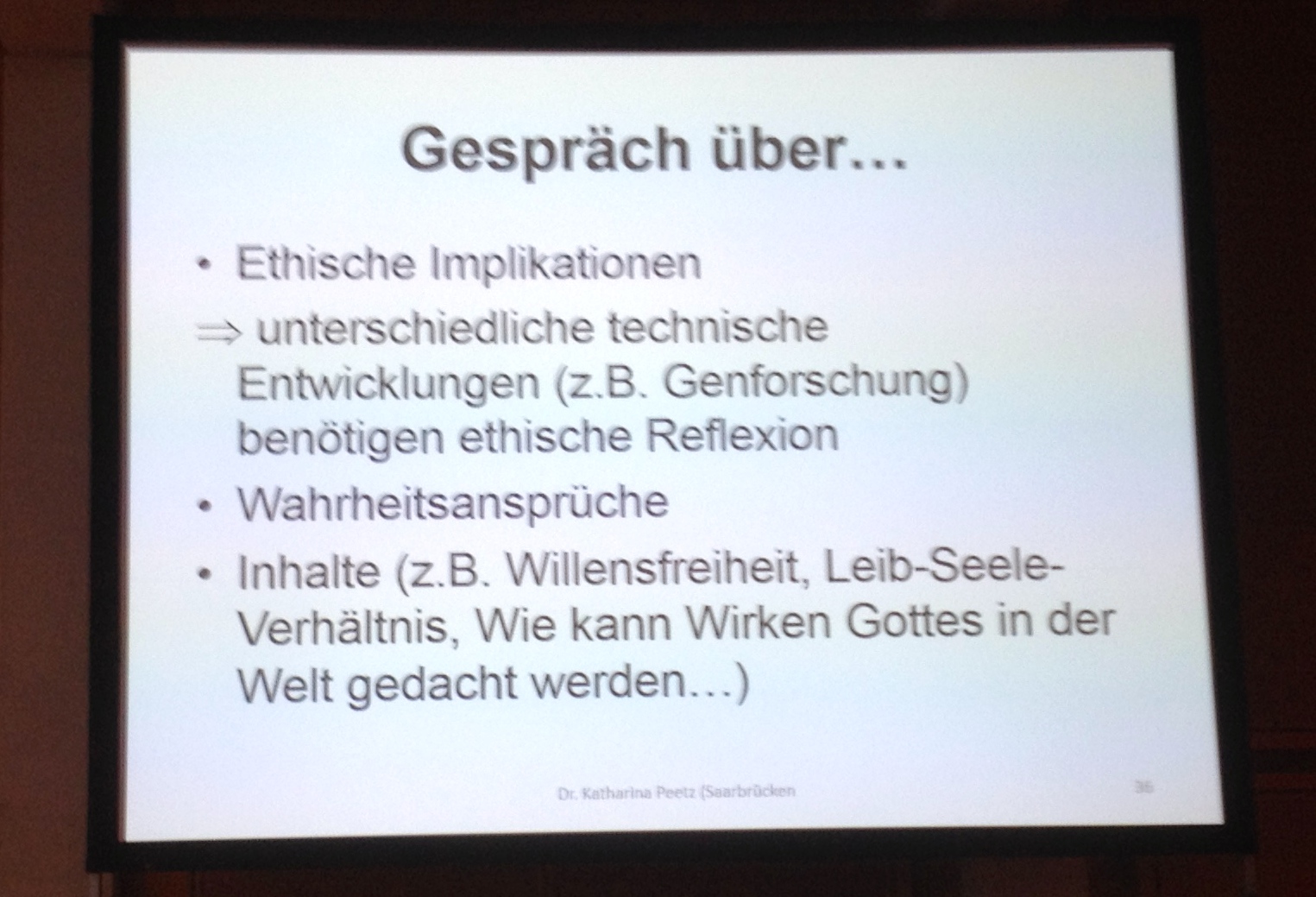 "Ursprünglich hab ich mir nur selten Fragen zur Entstehung des Lebens und komplexer Lebewesen gestellt“, so Lucia, „doch seit dem Vortrag bemerkte ich, wie ich zu überlegen begann". Thea ergänzt: "Haben die Naturwissenschaften den Glauben widerlegt und lassen ihn [Gott] als "Lückenbüßer- Gott" stehen?" Dem Vortrag von Frau Dr. Peetz "konnten wir gut folgen und es wurde nicht langweilig." Dr. Peetz habe sehr gut das konfliktreiche Thema dargestellt, beide Seiten, die der Naturwissenschaft und der Theologie, "ohne ihre eigene Meinung darüber zu stellen".