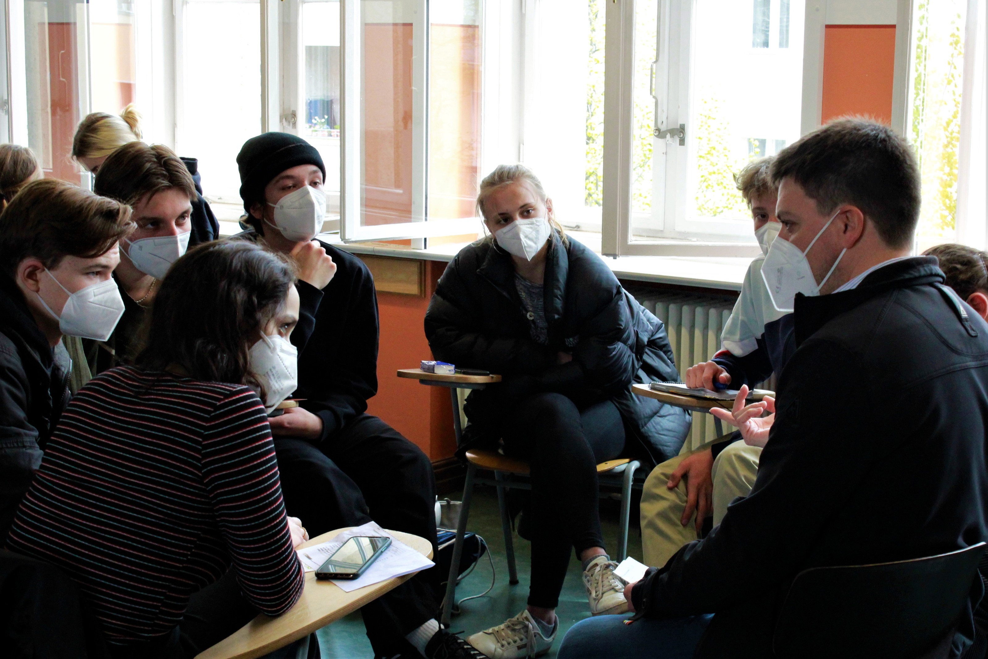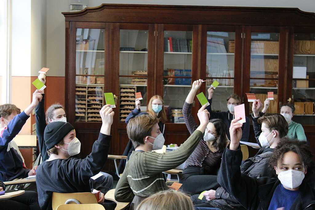 Bereits im Voraus schlossen sich die Schüler*innen der beiden Leistungskurse zu sechs Expertengruppen zusammen, in denen sie sich gemeinsam auf ihr Diskussionsthema vorbereiteten. Es sollte um aktuelle Debatten, wie den autofreien S-Bahnring, den gekippten Mietendeckel und die Begrenzung des Wahlalters ab 16 gehen und um anhaltende Diskussionen wie die Integrationshilfe, finanzielle Mittel für Jugendliche und die Umbenennung der Straßennamen, in denen Kolonialverbrechern gedacht wird.