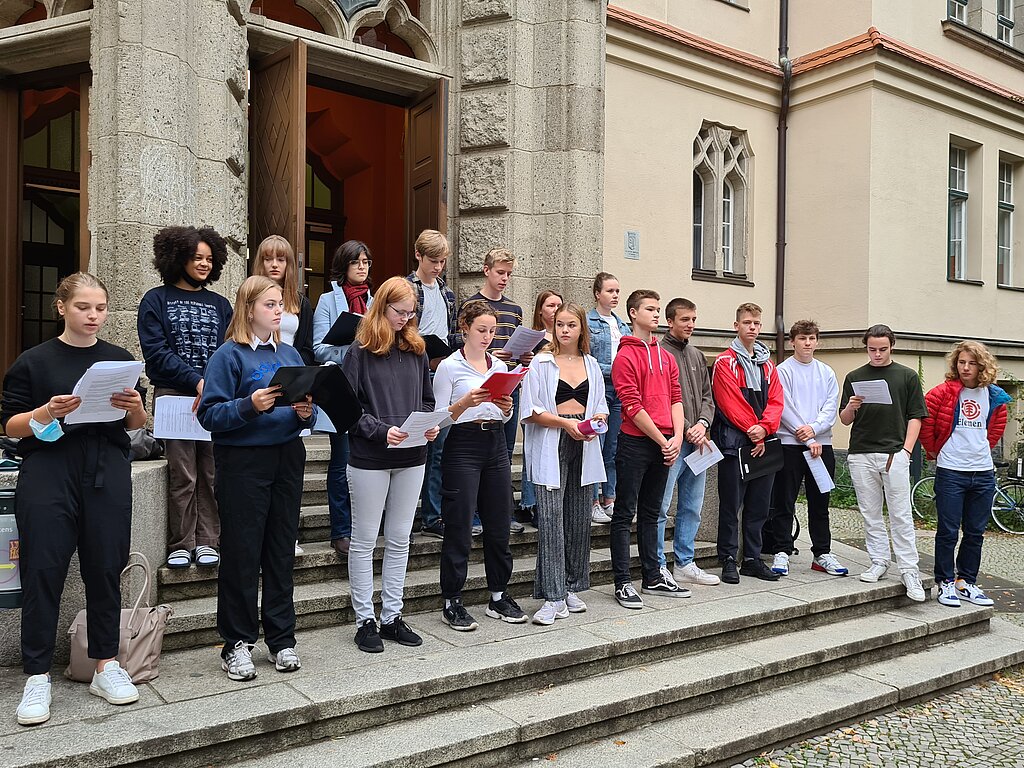 Mit stolzer Stimme trugen die Schüler*innen, auf dem Portal der Schule stehend, die einzelnen Menschenrechte vor, die am 10. Dezember 1948 von den Vereinten Nationen in Paris verabschiedet wurden und heute als das bedeutendste Menschenrechtsdokument gelten.