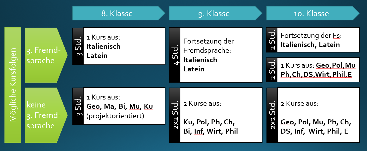 Die Einrichtung von Wahlpflichtfachkursen hängt jeweils von den Wahlen eines Jahrganges ab. Wählen zu wenig Schüler*innen ein Fach, dann kann dieser Kurs in diesem Jahr nicht stattfinden.